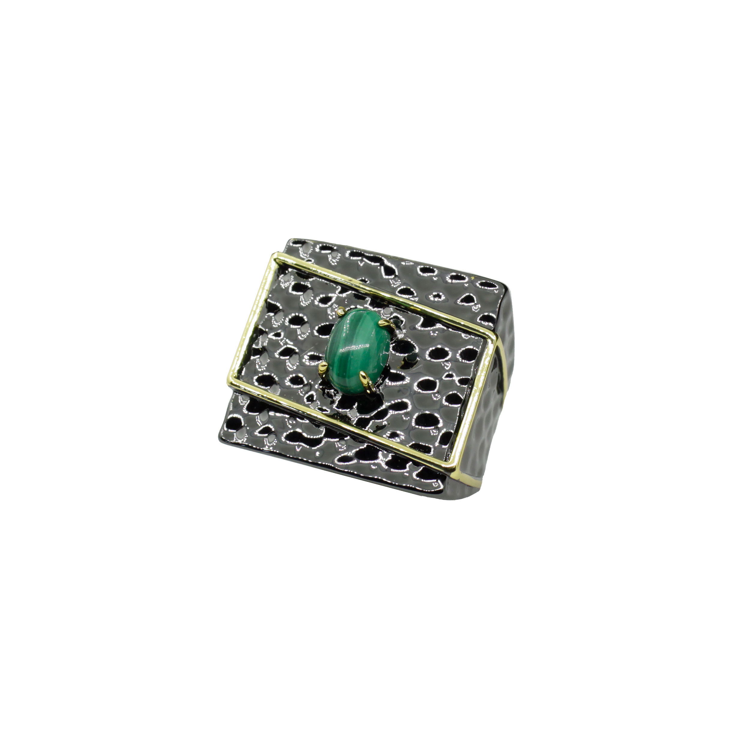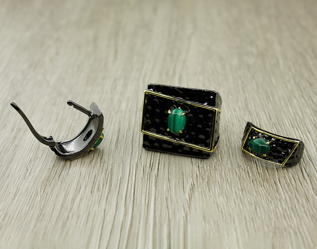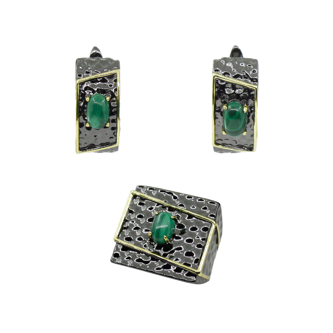 Стильный комплект с натуральным малахитом и качественным покрытием. Размер камня в серьге: 4x6мм, размер серьги с застежкой: 18мм. Размер камня в кольце: 5x7мм.