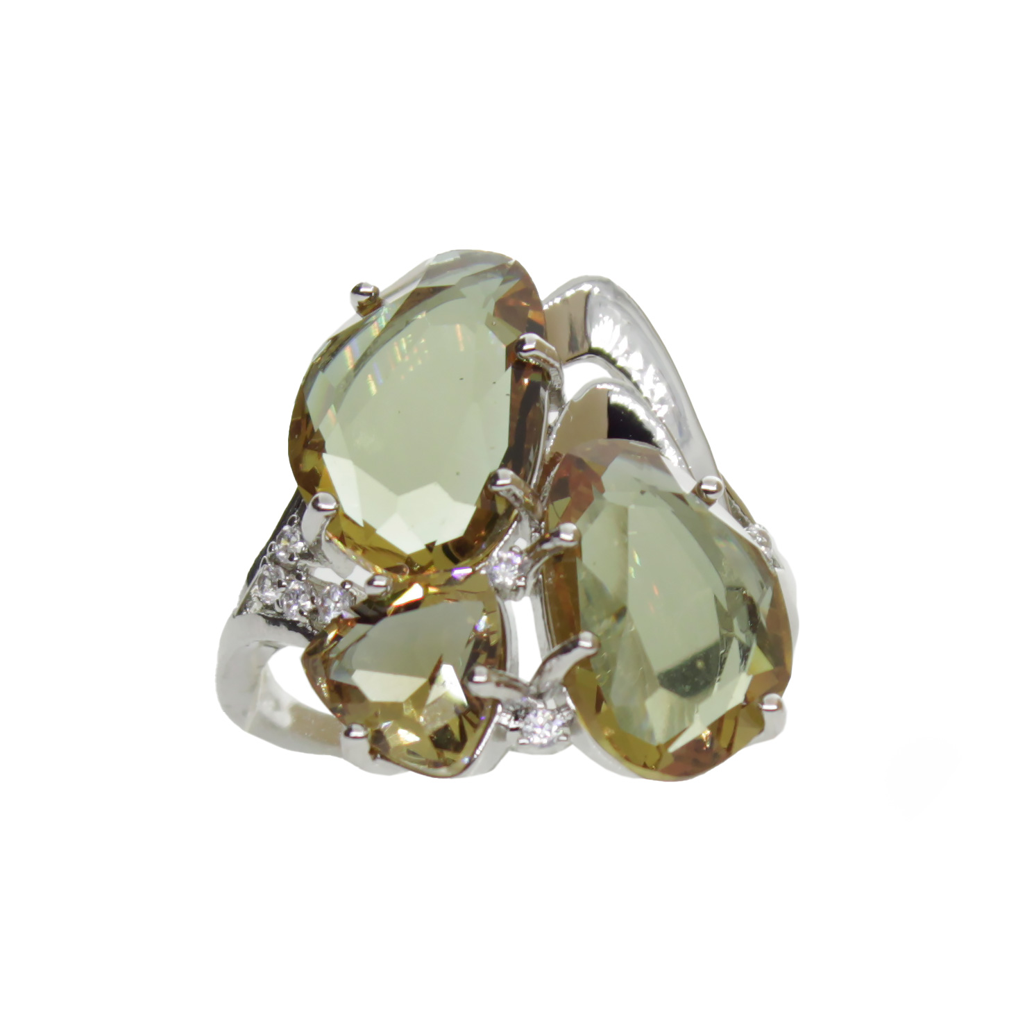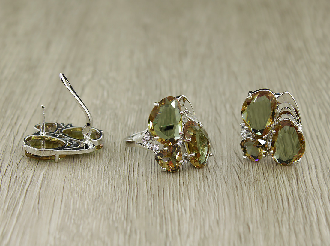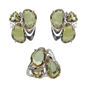 Элегантный комплект со вставкой из султанита и родированным покрытием. Размер больших кабошонов: 10х14мм, декоративной части кольца и серёжек: 20х22мм.