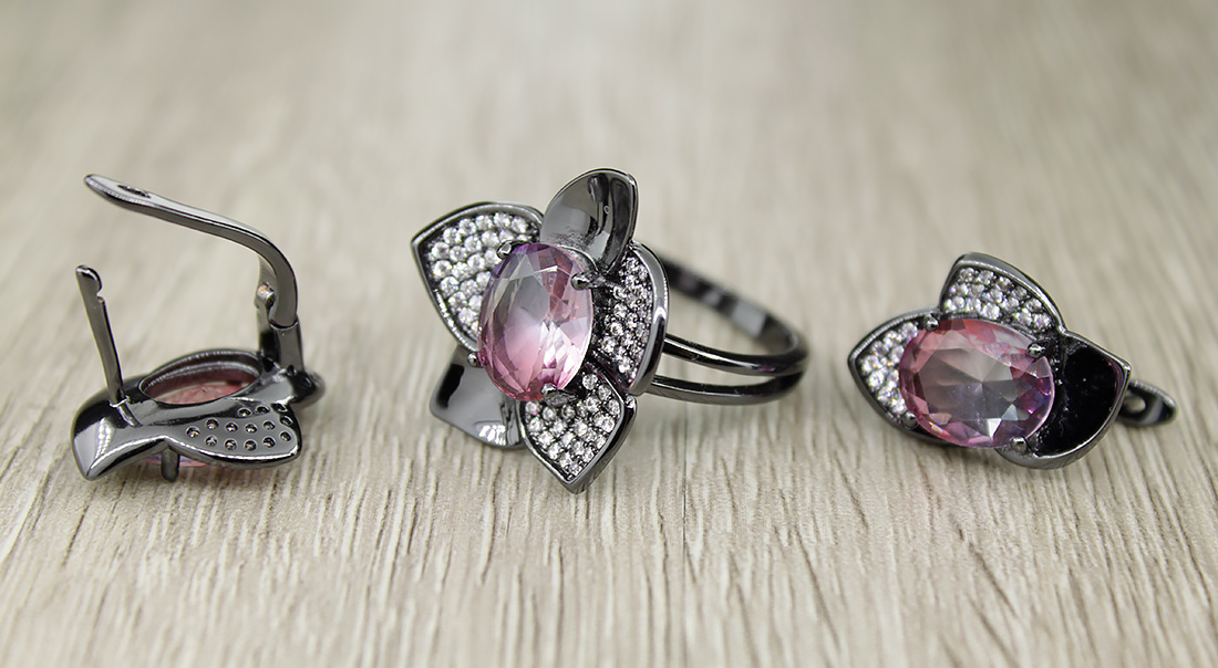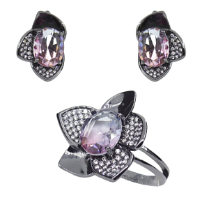 Нежный комплект в виде цветка с фианитом "турмалин" фиолетово - голубого цвета. Размер камня в серьге: 8х11мм, размер серьги с застежкой: 18мм. Размер камня в кольце: 8х10мм. Размера кольца 19х20мм