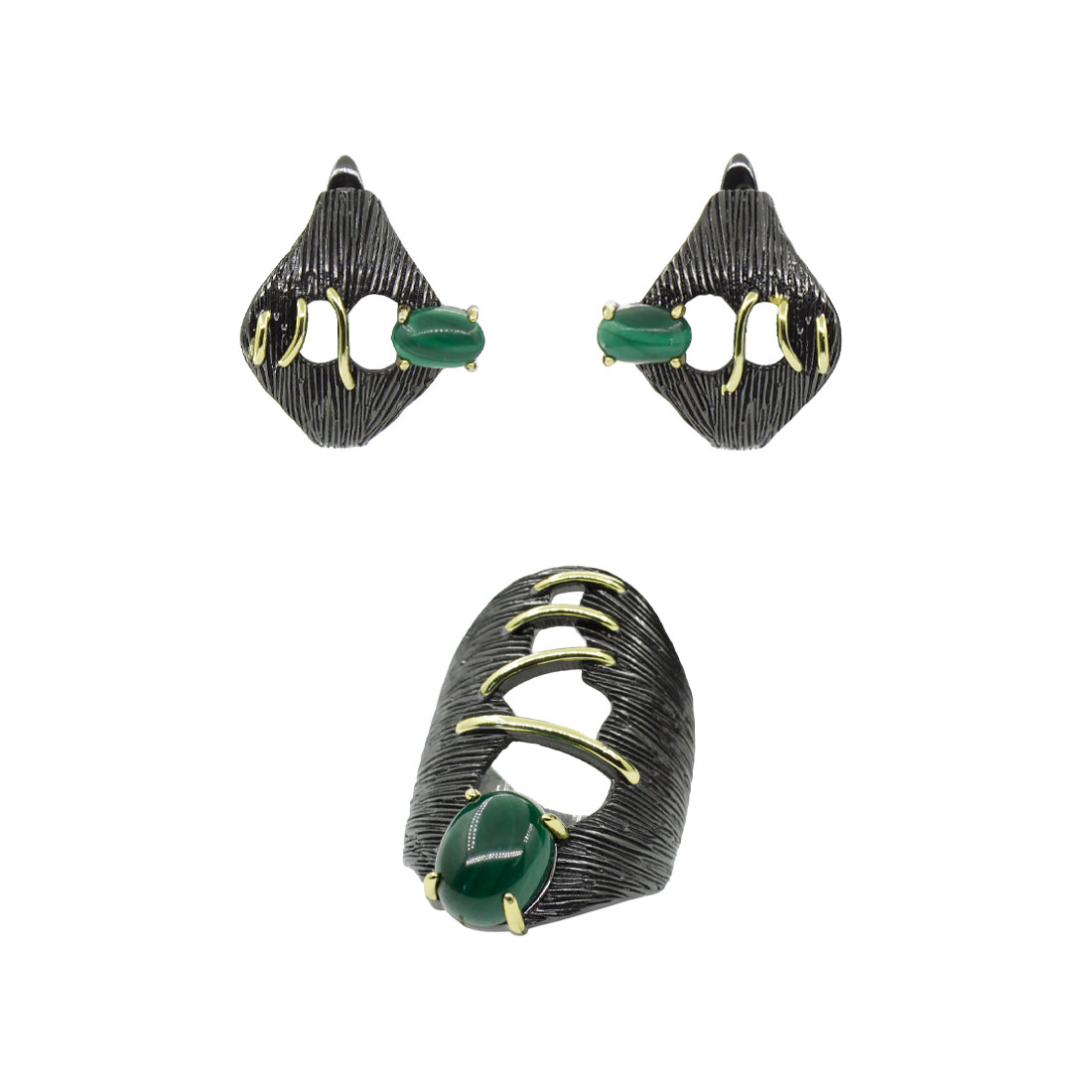 Стильный комплект с натуральным малахитом и качественным покрытием. Размер камня в серьге: 4x6мм, размер серьги с застежкой: 16мм. Размер камня в кольце: 8x10мм.