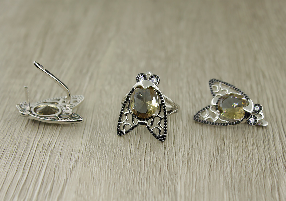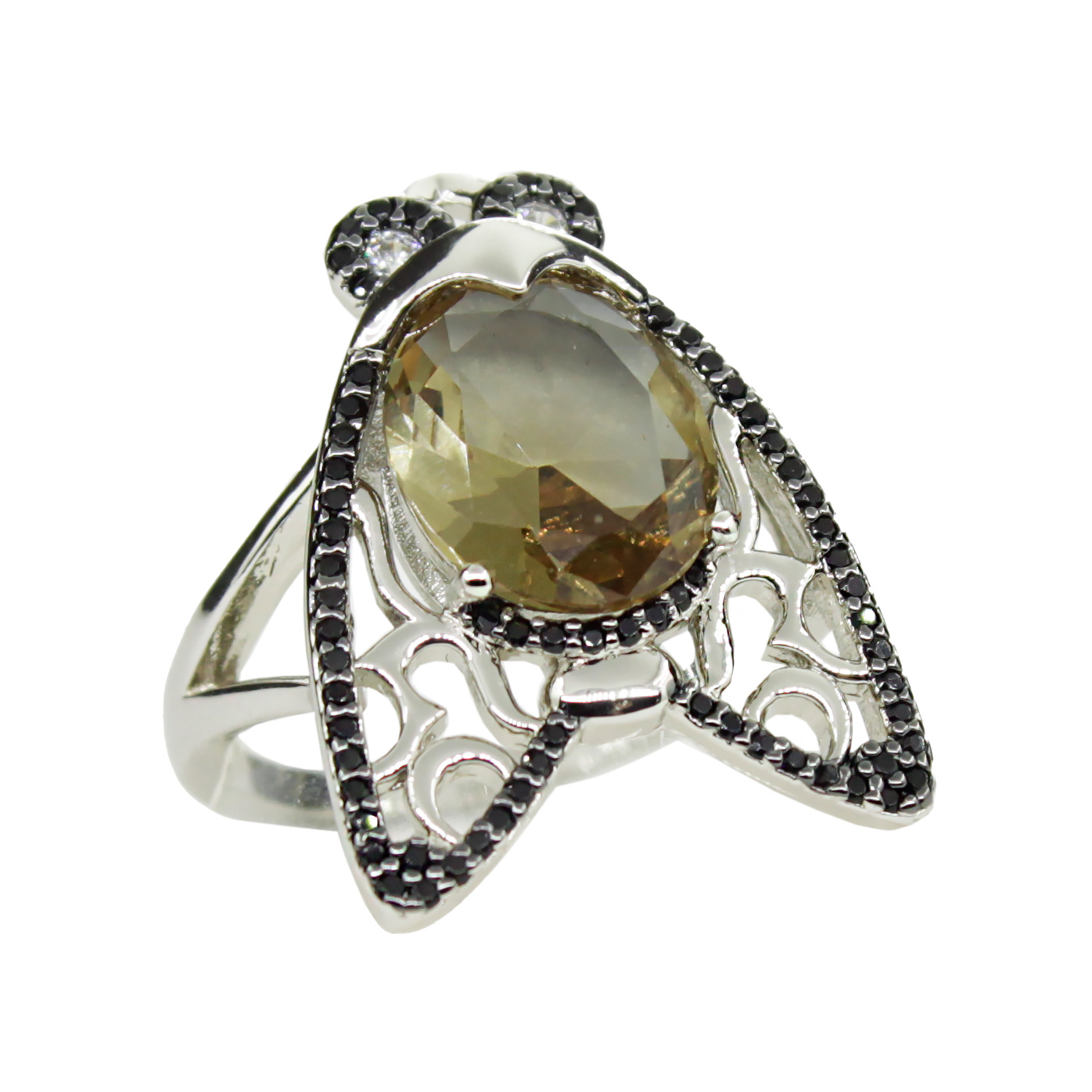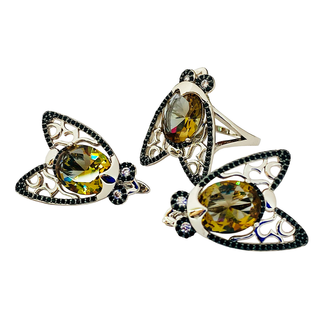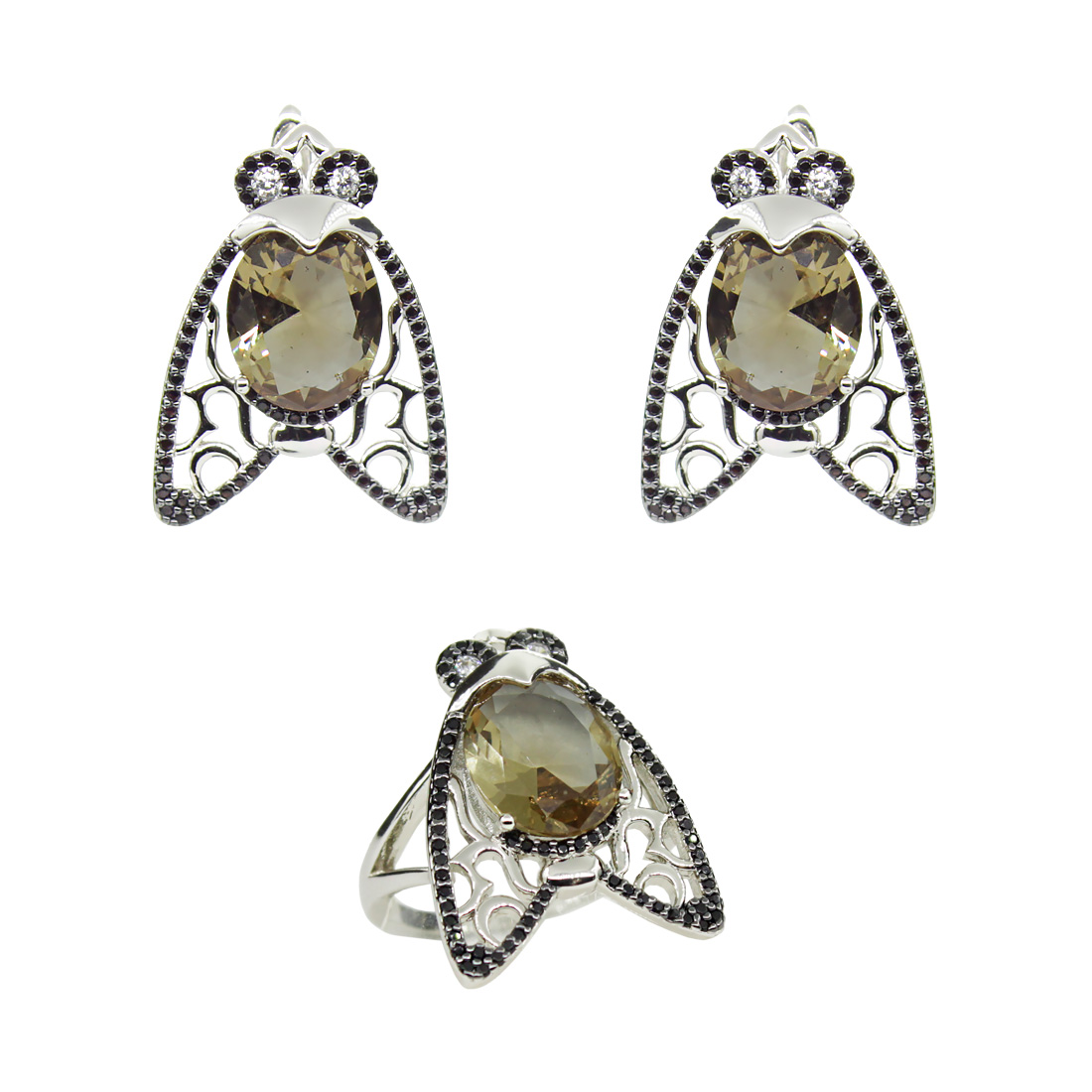 Забавный комплект в виде мухи со вставкой из султанита и родированным покрытием. Размер декоративной вставки: 20х27мм. Размер камня: 5х7мм.