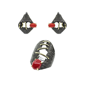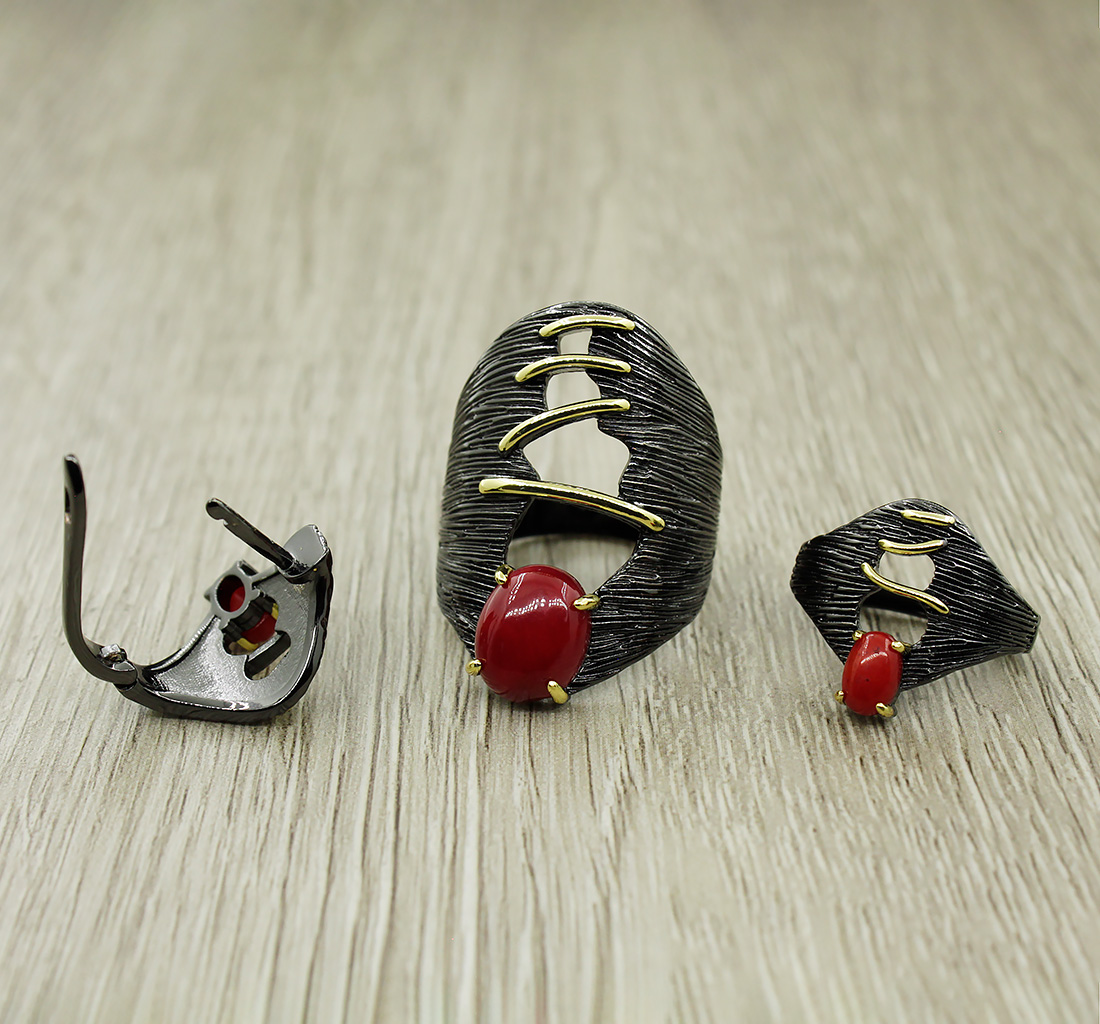 Яркий комплект с натуральным кораллом и качественным покрытием. Размер камня в серьге: 4x6мм, размер серьги с застежкой: 16мм. Размер камня в кольце: 8x10мм.
