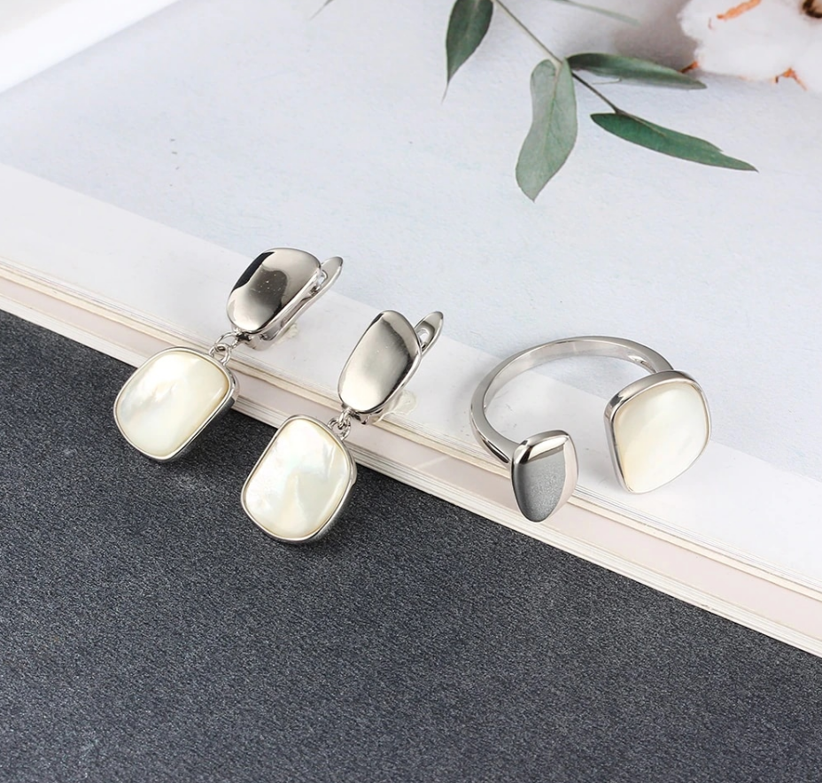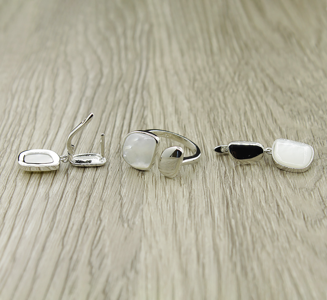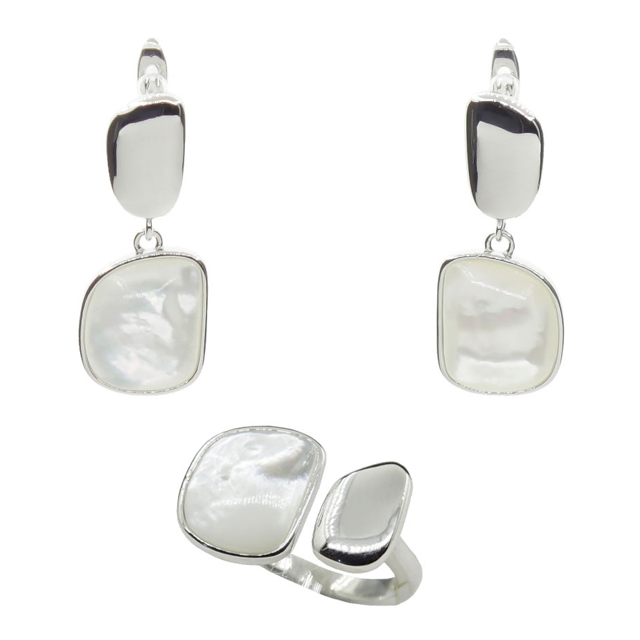 Комплект "Илаида-11", перламутр (Индонезия), покрытие родий, кольцо безразмерное