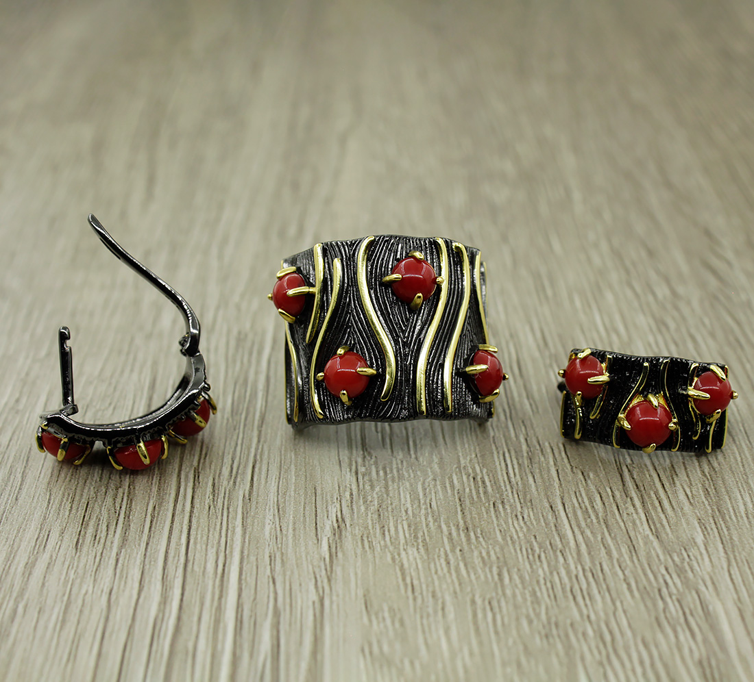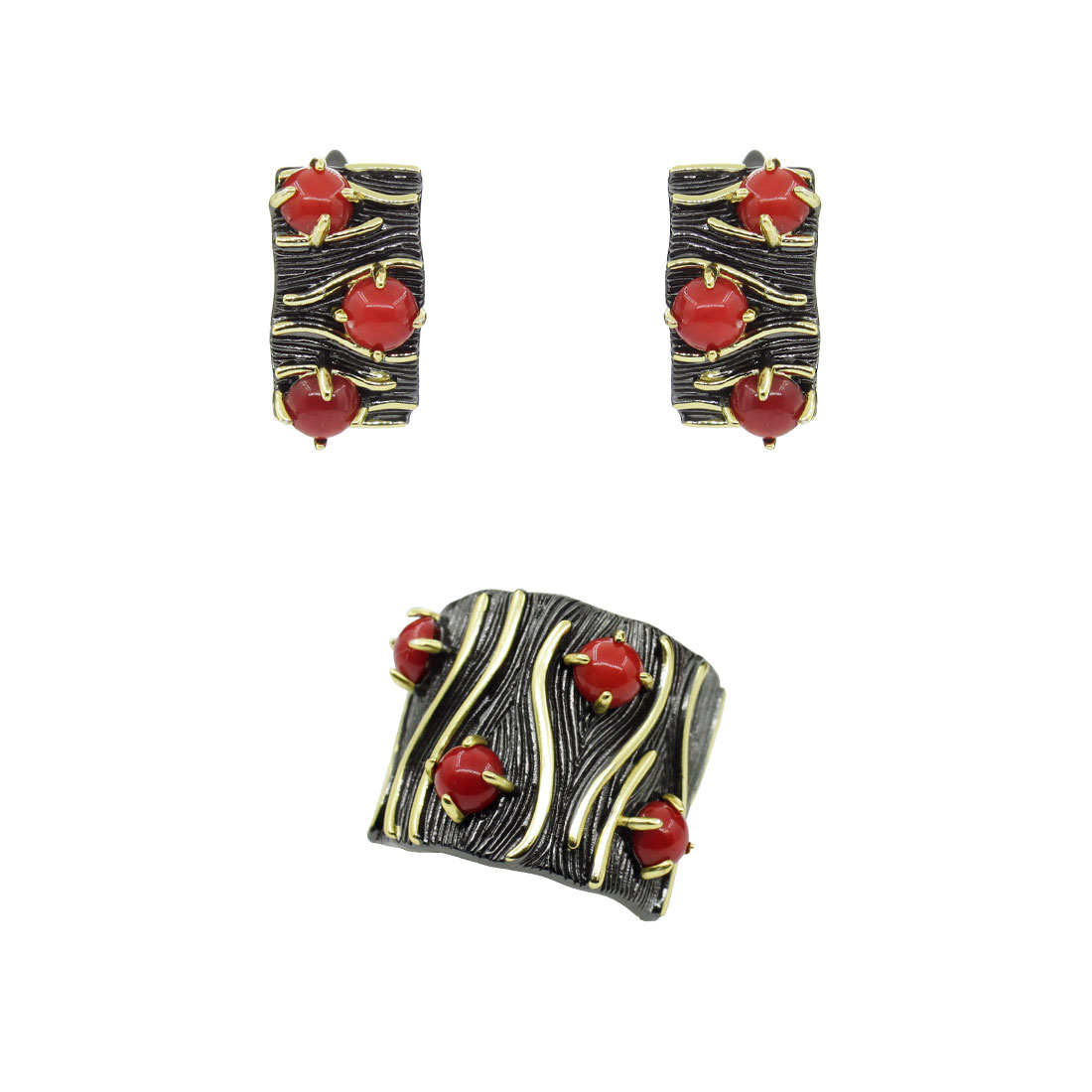 Яркий комплект с натуральным кораллом и качественным покрытием. Диаметр камня в серьге: 4,5мм, размер серьги с застежкой: 18мм. Размер камня в кольце: 4,5мм.