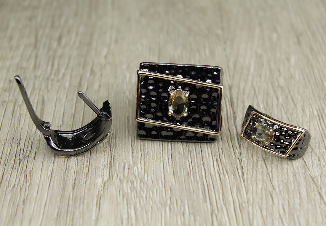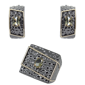 Стильный комплект с султанитом и качественным покрытием. Размер камня в серьге: 4х6мм, размер серьги с застежкой: 17.5мм. Размер камня в кольце: 5х7мм.Ширина кольца 20мм.