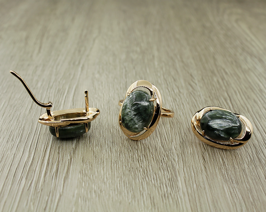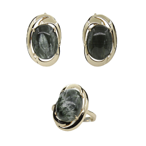 Элегантный комплект с натуральным серафинитом и качественным покрытием. Размер камня в серьге: 12x16мм, размер серьги с застежкой: 24мм. Размер камня в кольце: 12x16мм.