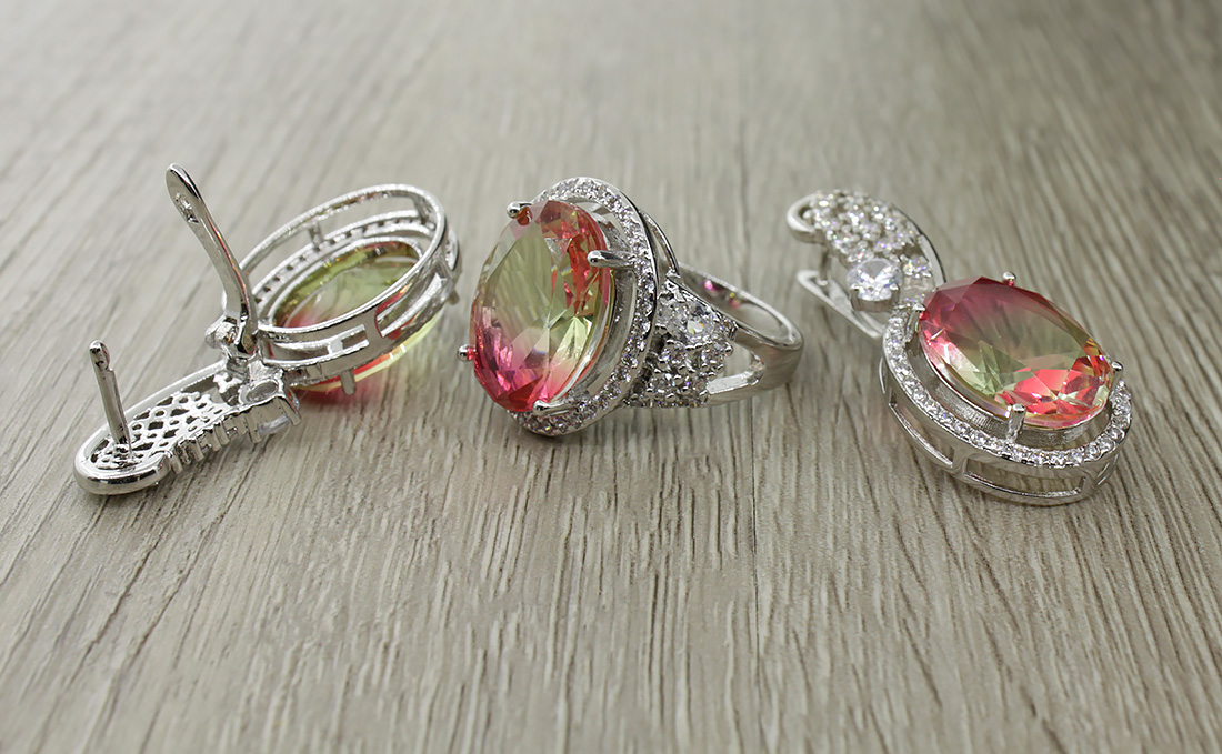 Удивительный комплект с фианитом "турмалин" желто-красного цвета. Размер камня в серьге: 12х16мм, размер серьги с застежкой: 36.5мм. Размер камня в кольце: 12х15мм.Ширина кольца 20мм