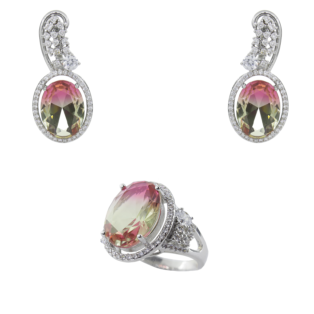 Комплект "Линда" фианит "турмалин" желто-красный покрытие родий, размеры кольца: 17, 18, 19, 20