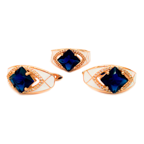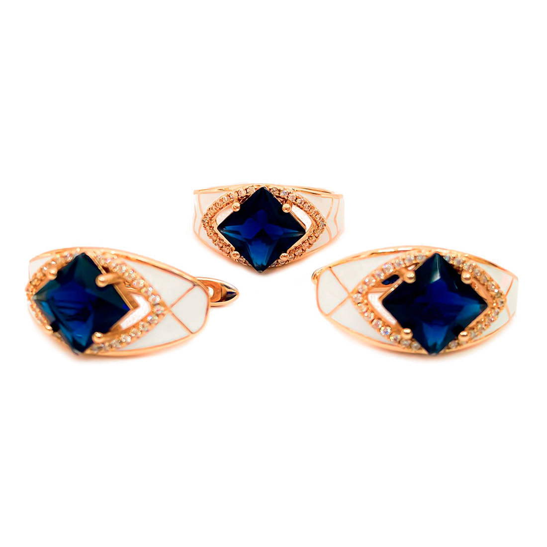 Комплект с фианитом цвета «сапфир», с белой эмалью высокого качества и покрытием под золото. Находится на удаленном складе (отгрузка на 2 дня позже). Размер камня в кольце и в серьге: 8x8мм, размер серьги с застежкой: 23мм.