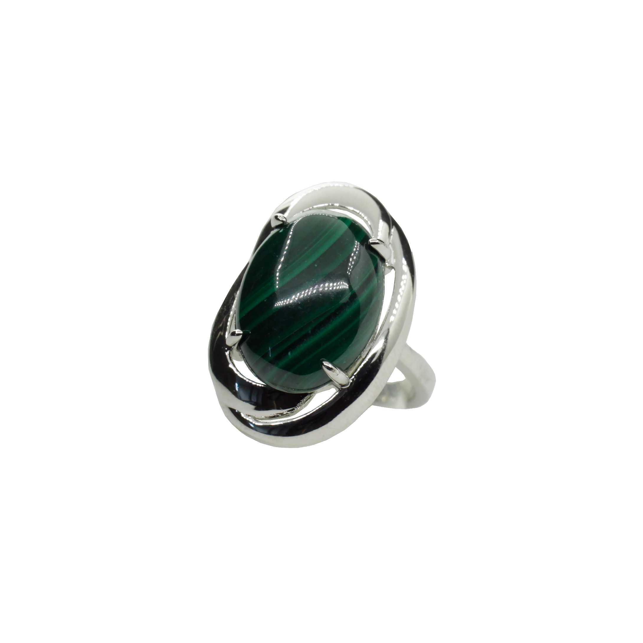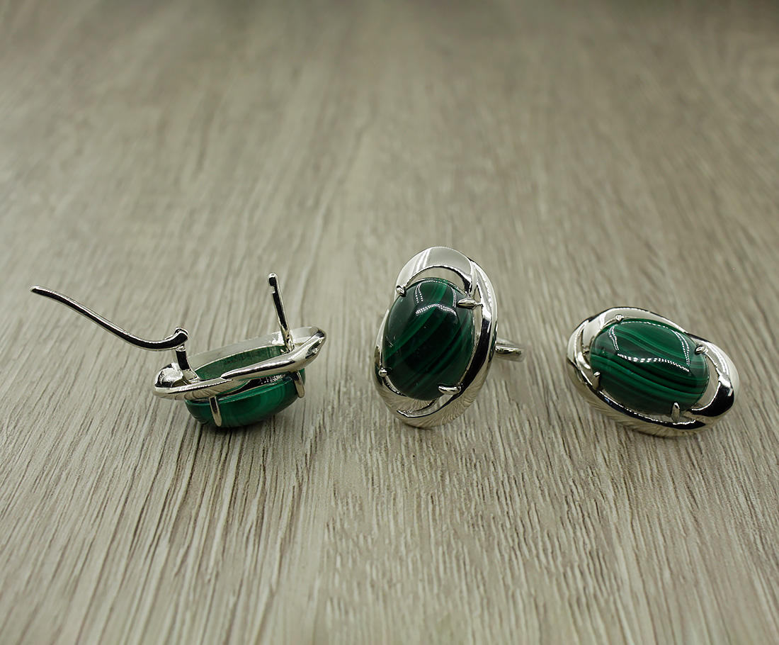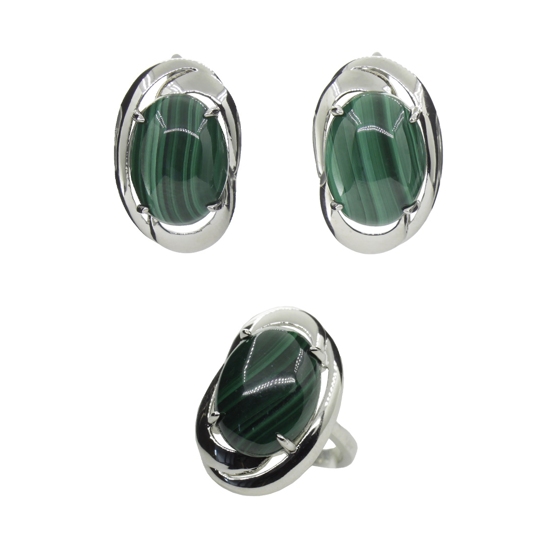 Стильный комплект с натуральным малахитом и качественным покрытием. Размер камня в серьге: 12x16мм, размер серьги с застежкой: 24мм. Размер камня в кольце: 12x16мм.