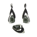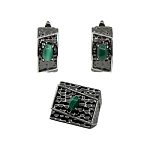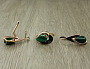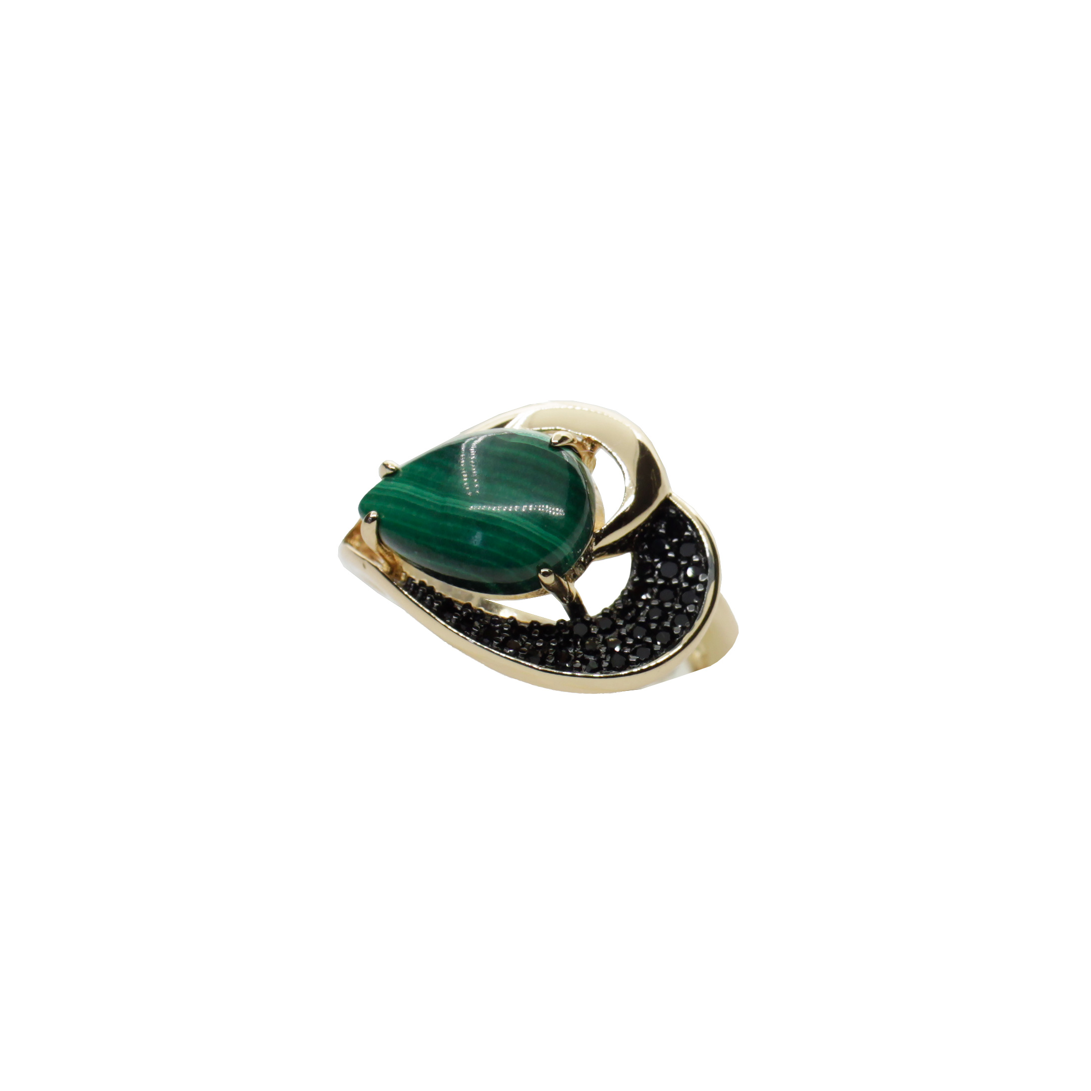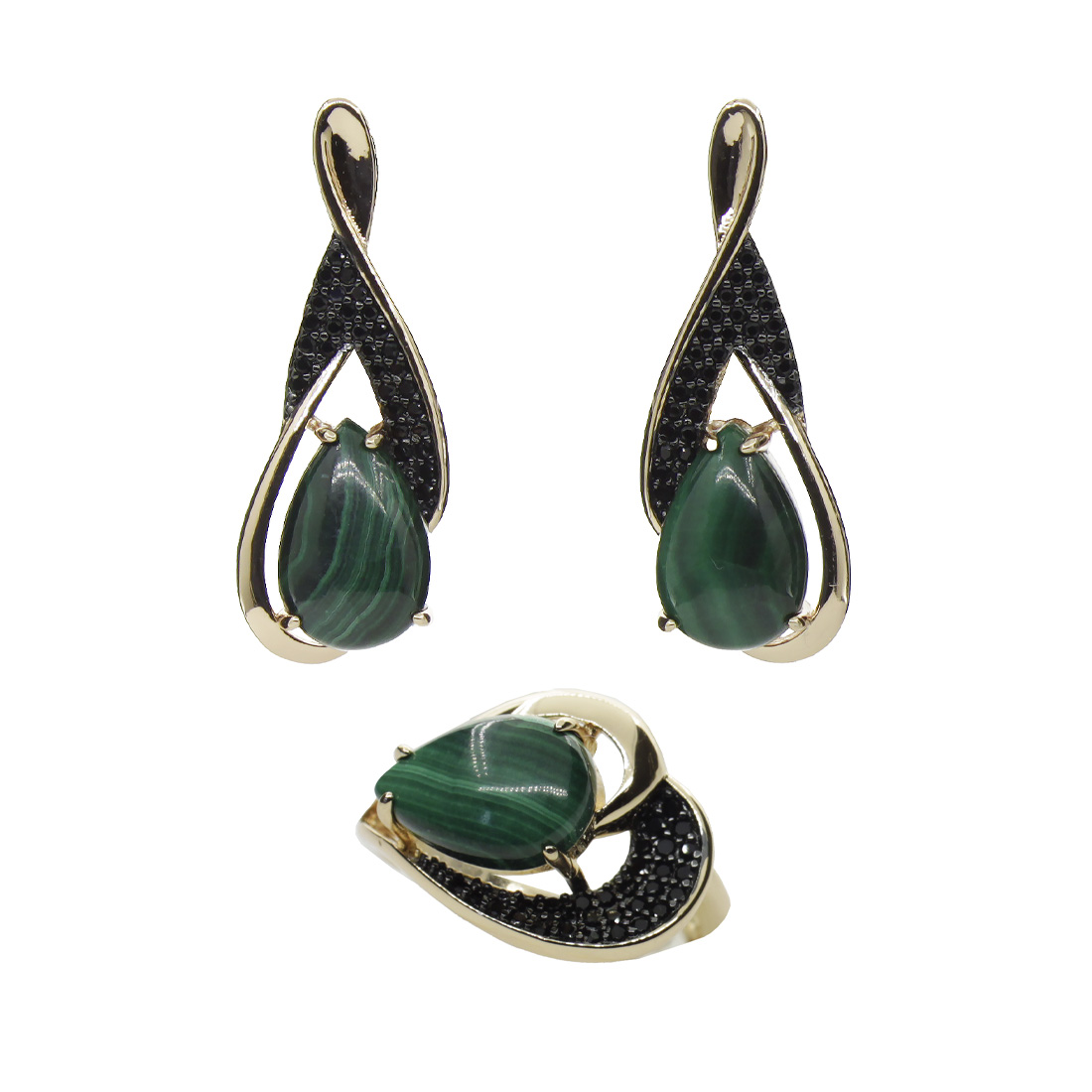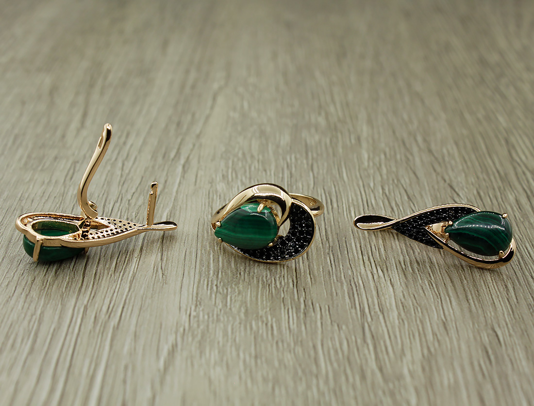 Стильный комплект с натуральным малахитом и качественным покрытием. Размер камня в серьге: 8x12мм, размер серьги с застежкой: 30мм. Размер камня в кольце: 8x12мм.