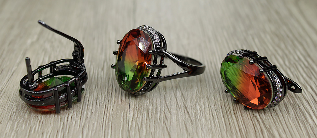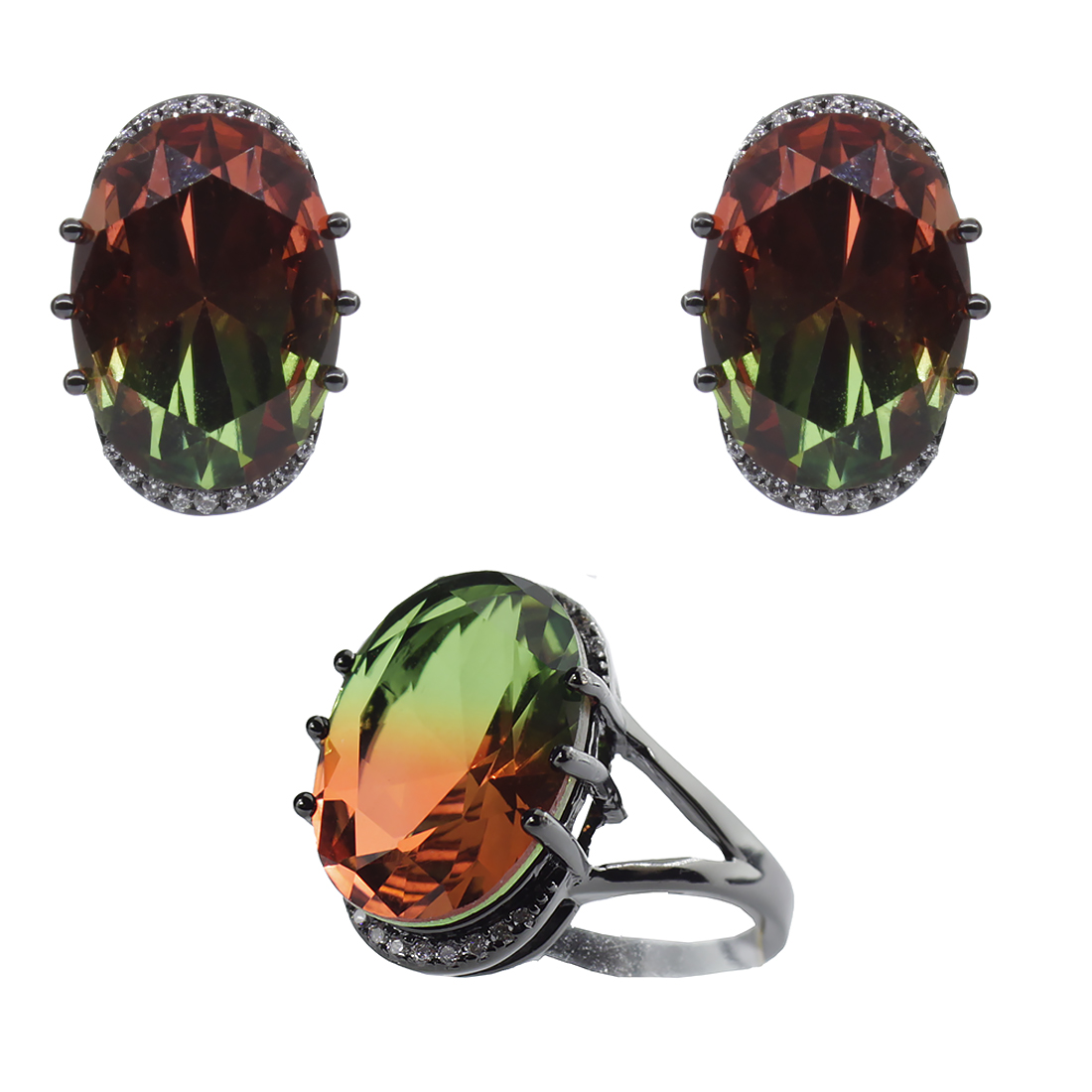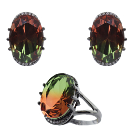 Удивительный комплект с крупным фианитом "турмалин" красно-зеленого цвета. Размер камня в серьге: 13х18мм, размер серьги с застежкой: 20,5мм. Размер камня в кольце: 13х18мм.