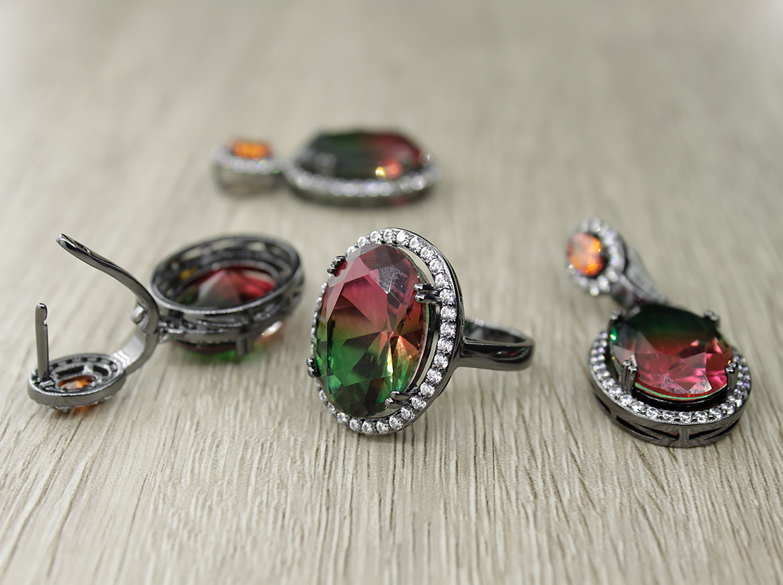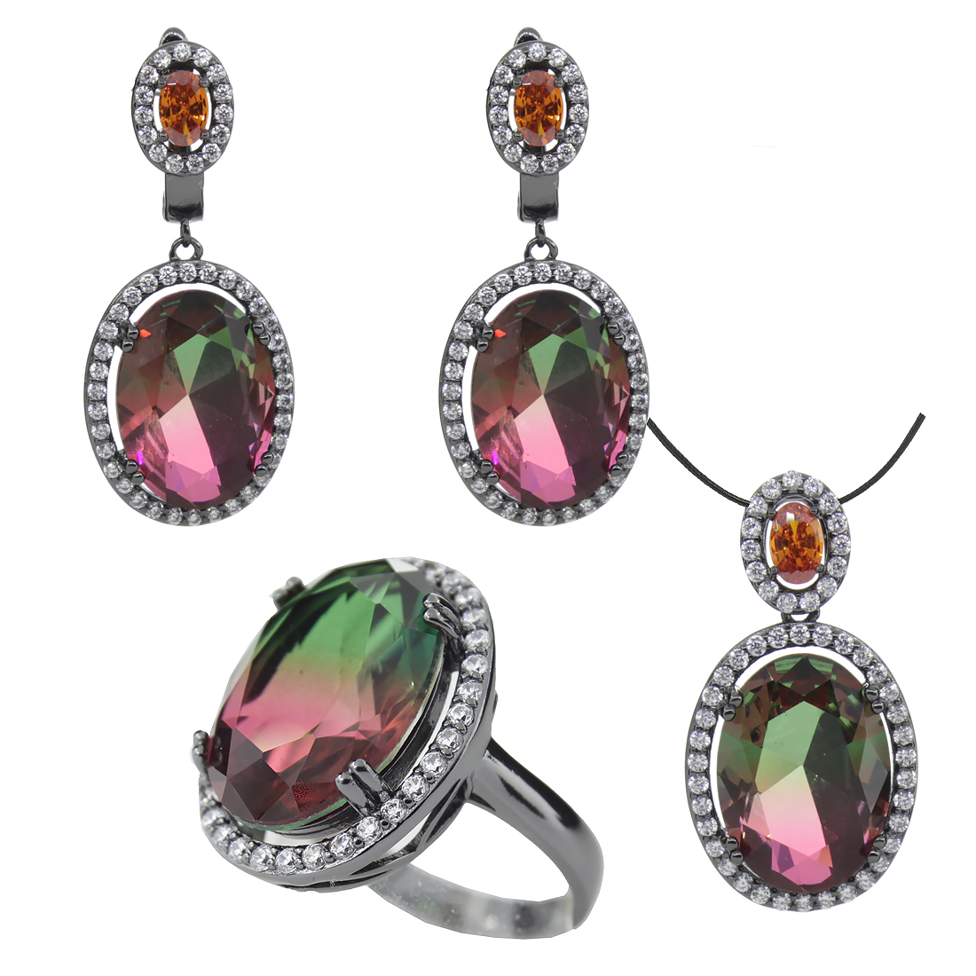Полный комплект с крупным фианитом "турмалин" красно-зеленого цвета, состоящий из кольца, сережек и подвески. Размер камня в серьге: 13х18мм, размер серьги с застежкой: 40мм. Размер камня в кольце: 13х18мм. Размер камня в подвеске 13х18, размер подвески целиком 33мм