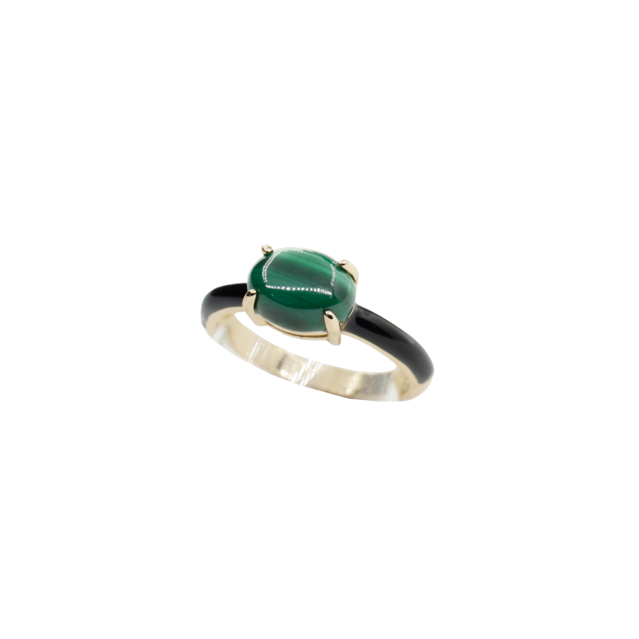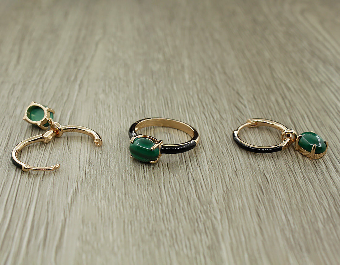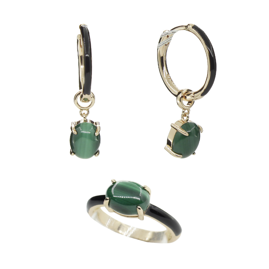 Стильный комплект с натуральным малахитом и качественным покрытием. Размер камня в серьге: 7x9мм, размер серьги с застежкой: 30мм. Размер камня в кольце: 7x9мм.