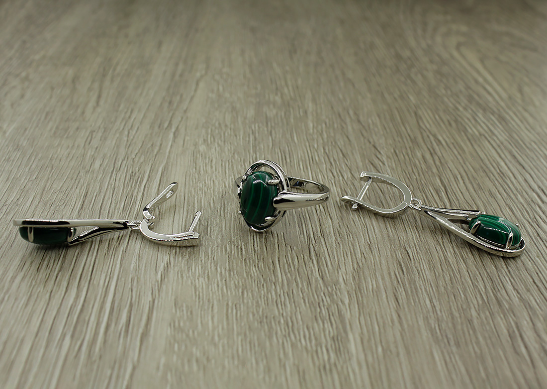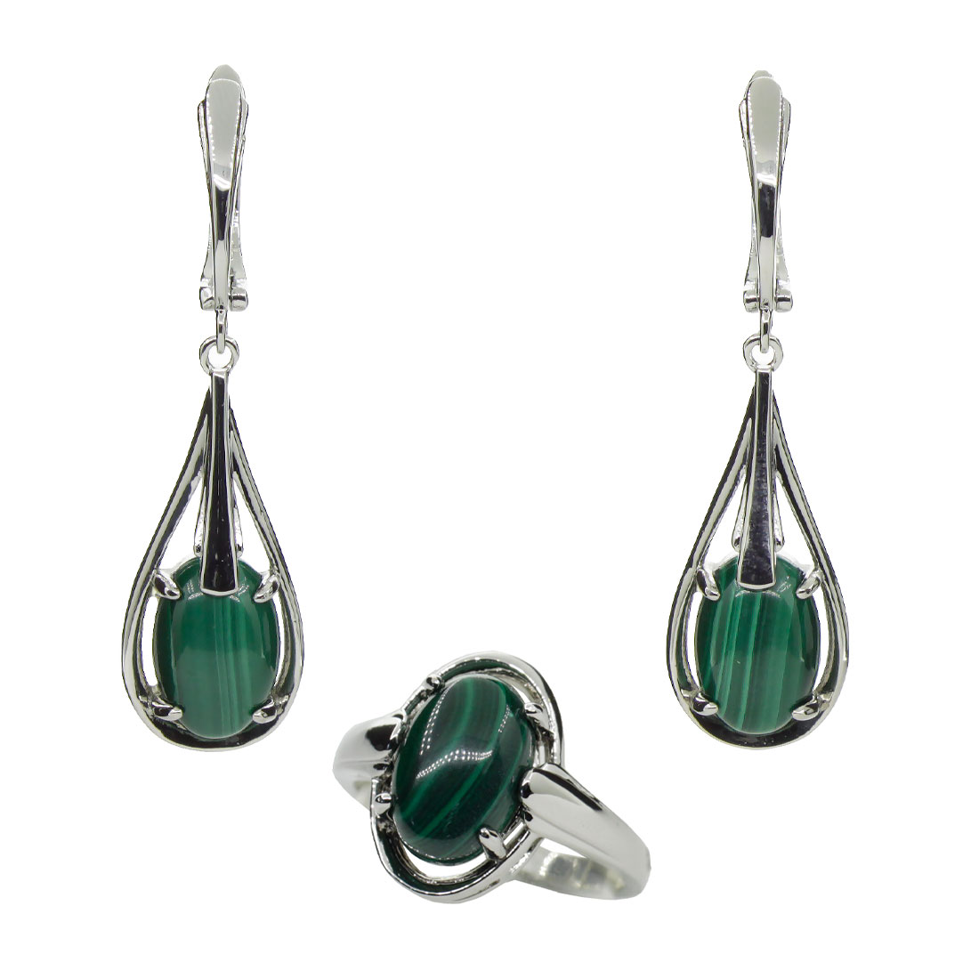 Стильный комплект с натуральным малахитом и качественным покрытием. Размер камня в серьге: 8x12мм, размер серьги с застежкой: 42мм. Размер камня в кольце: 8x12мм.