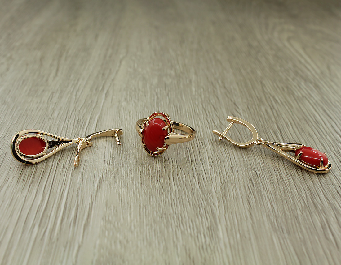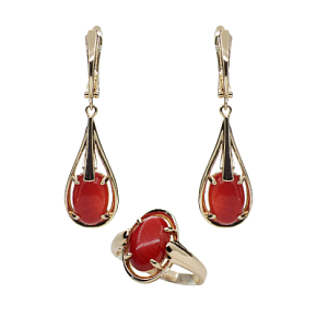 Яркий комплект с натуральным кораллом и качественным покрытием. Размер камня в серьге: 8x12мм, размер серьги с застежкой: 42мм. Размер камня в кольце: 8x12мм.