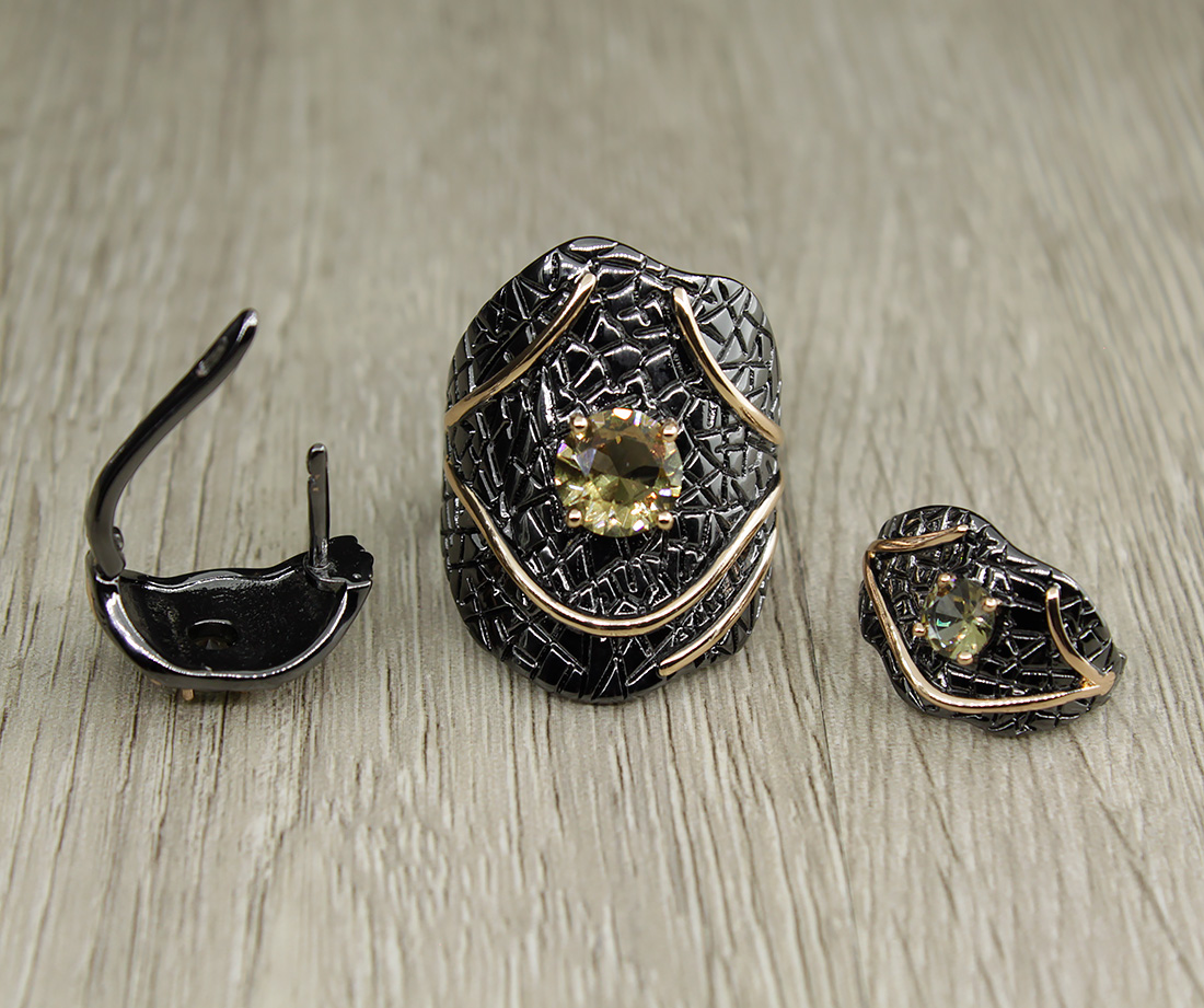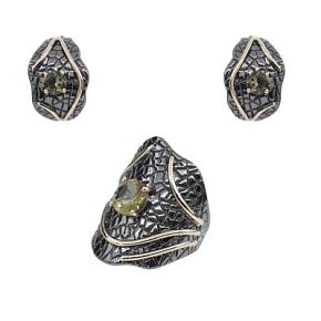 Стильный комплект с султанитом и качественным покрытием. Размер камня в серьге: 5мм, размер серьги с застежкой: 18.5мм. Диаметр камня в кольце: 8мм.Ширина кольца 29мм