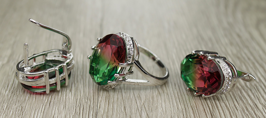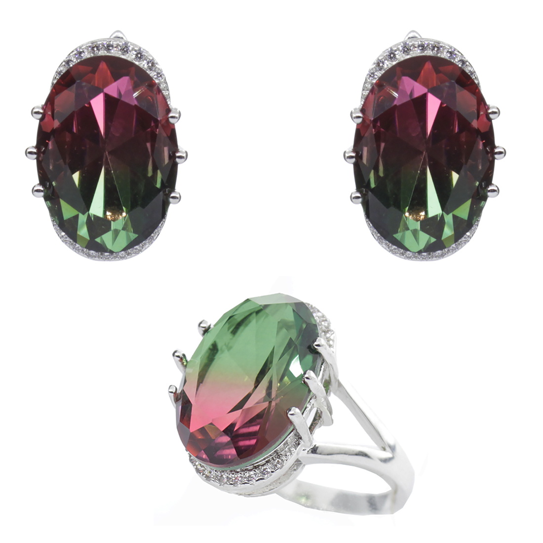 Удивительный комплект с крупным фианитом "турмалин" красно - зеленого цвета.Размер камня в серьге: 13х18мм, размер серьги с застежкой: 20,5мм. Размер камня в кольце: 13х18мм.
