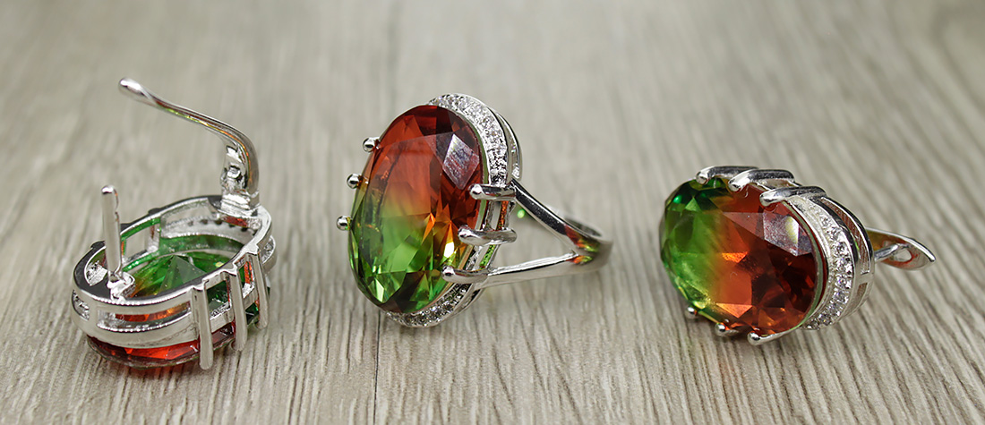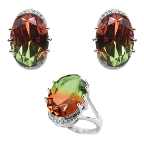 Удивительный комплект с крупным фианитом "турмалин" красно - желтого цвета.Размер камня в серьге: 13х18мм, размер серьги с застежкой: 20,5мм. Размер камня в кольце: 13х18мм.