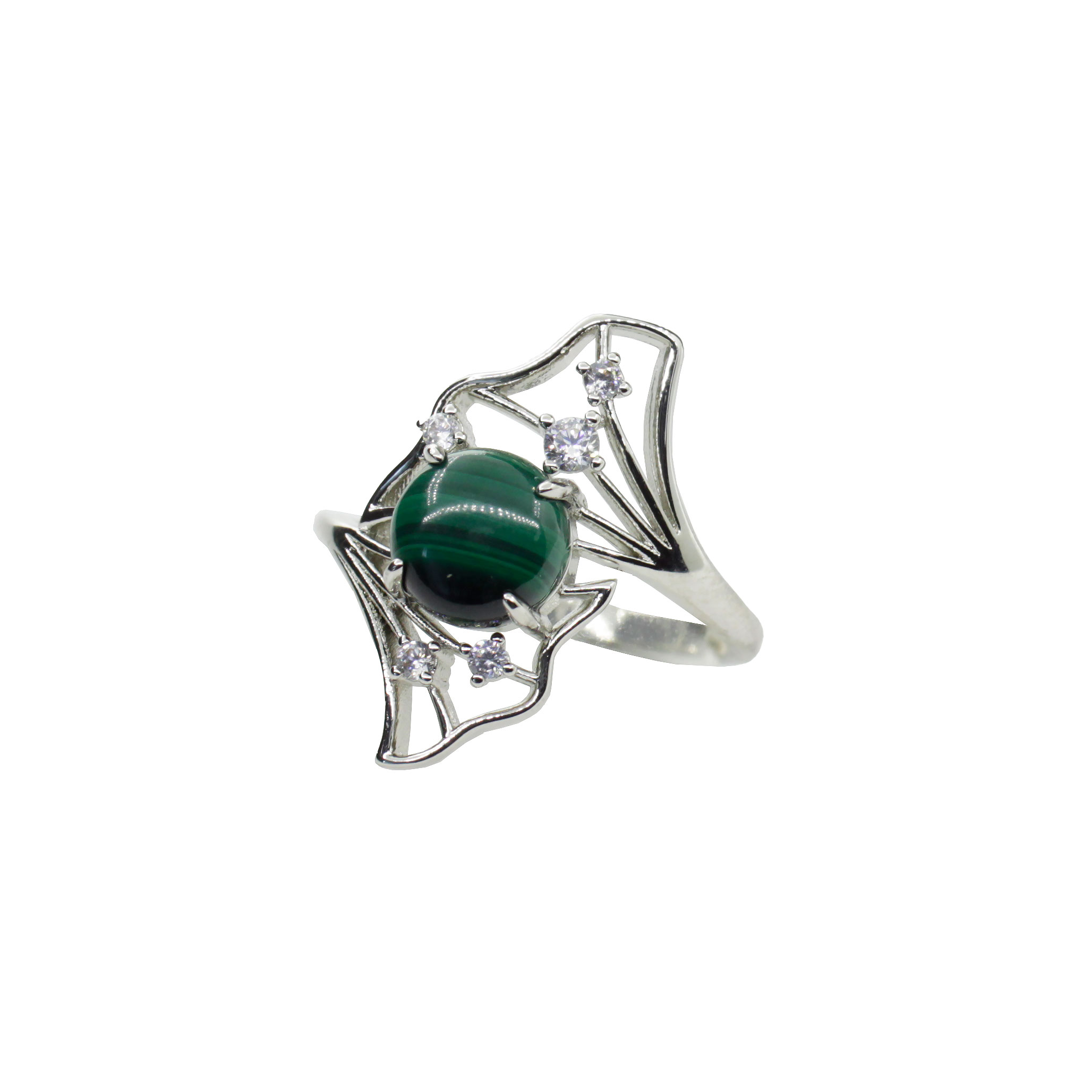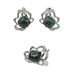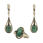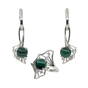 Стильный комплект с натуральным малахитом и качественным покрытием. Диаметр камня в серьге: 7мм, размер серьги с застежкой: 35мм. Диаметр камня в кольце: 8мм.