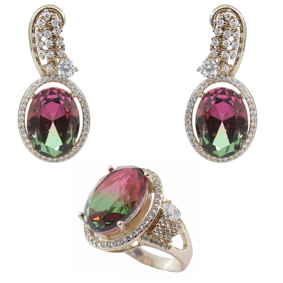 Комплект "Линда" фианит "турмалин" красно - зеленый покрытие под золото, размеры кольца: 17, 18, 19, 20