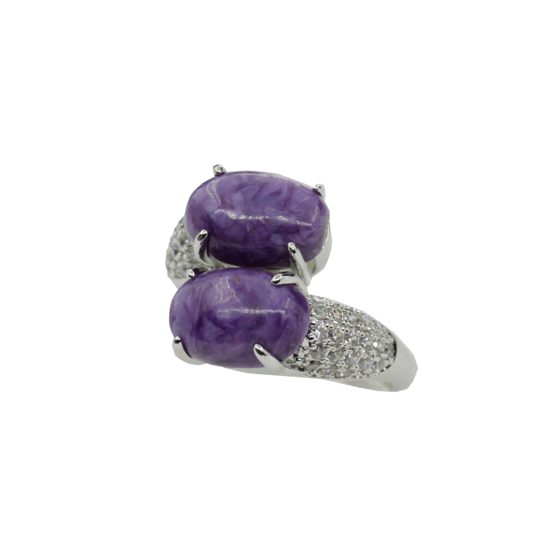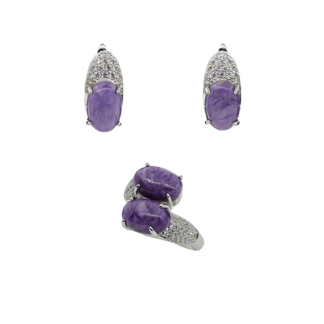 Манящий комплект с натуральным чароитом и качественным покрытием. Размер камня в серьге: 8x12мм, размер серьги с застежкой: 19мм. Размер камня в кольце: 8x12мм.