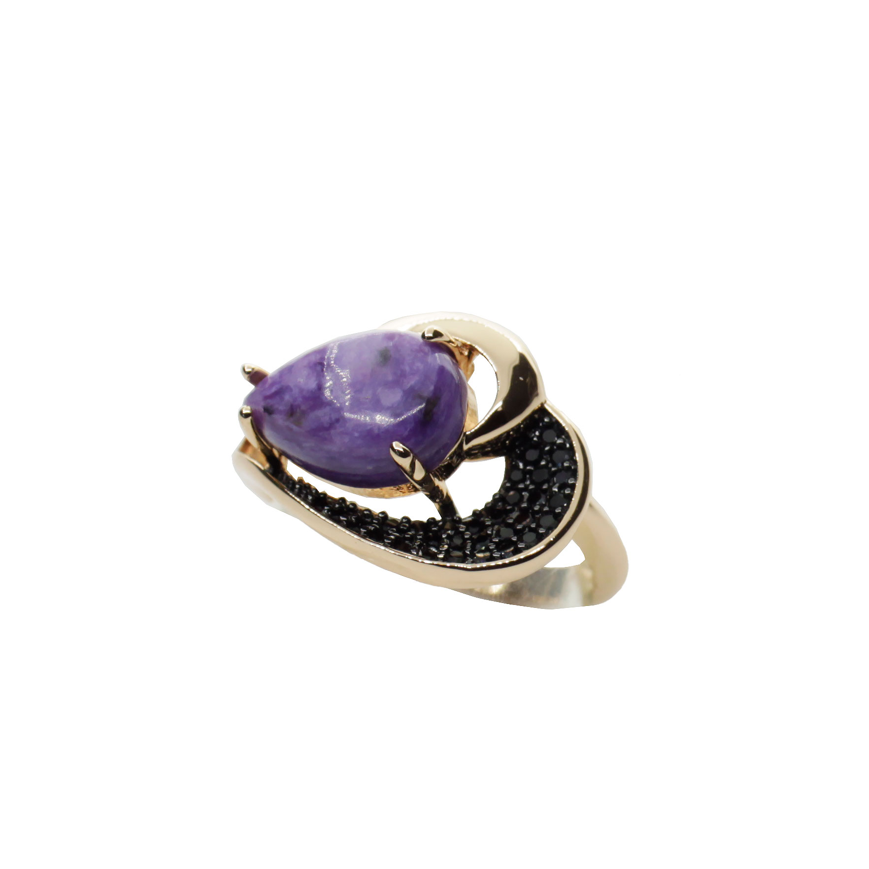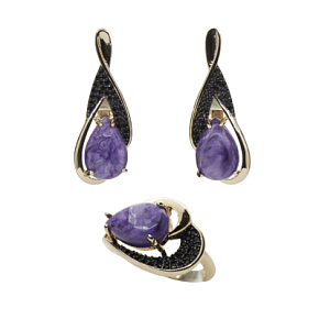 Манящий комплект с натуральным чароитом и качественным покрытием. Размер камня в серьге: 8x12мм, размер серьги с застежкой: 30мм. Размер камня в кольце: 8x12мм