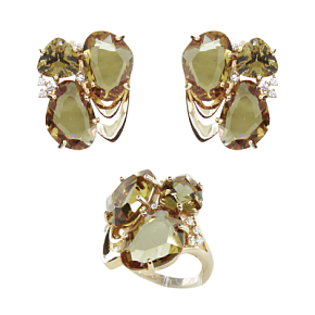 Элегантный комплект со вставкой из султанита и качественным покрытием. Размер больших кабошонов: 10х14мм, декоративной части кольца и серёжек: 20х22мм.