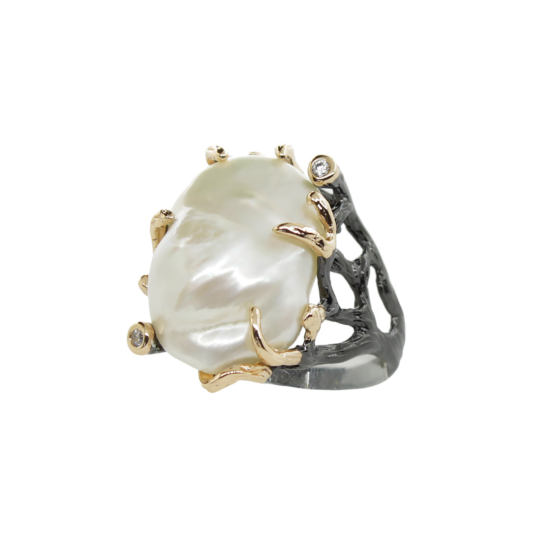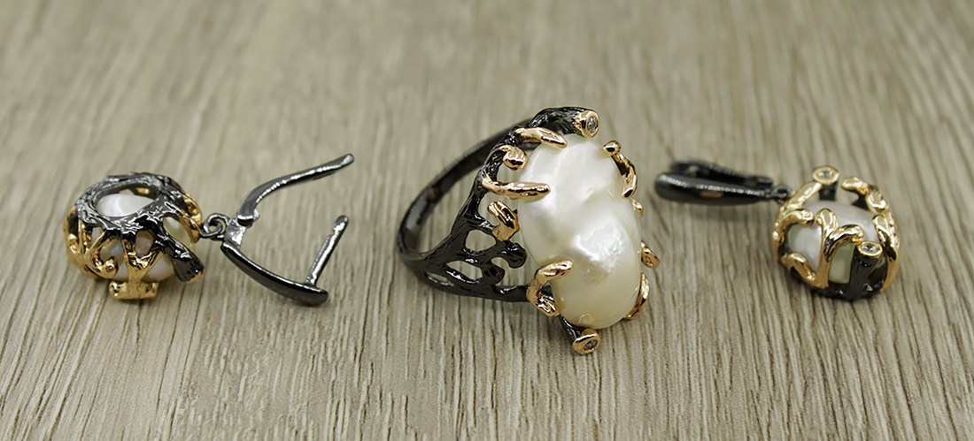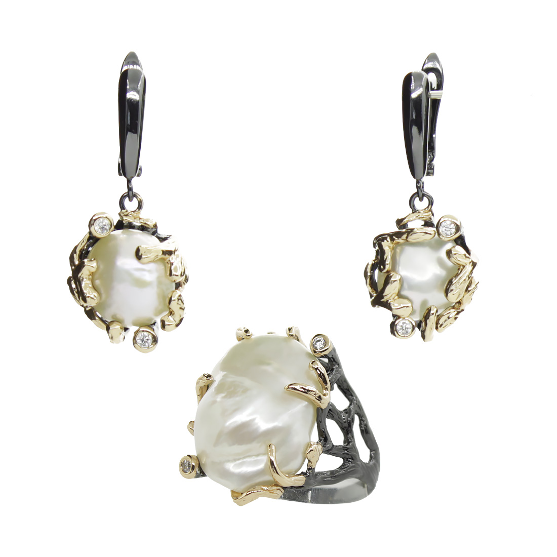 Комплект "Сеньорита" жемчуг барочный, черная с золотым оправа, размер кольца 20