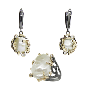 Эффектный комплект с натуральным, очень крупным жемчугом. Размер жемчужины в кольце: 16х22мм, в серьгах - около 10мм. Длина серьги с застёжкой: 30мм.
