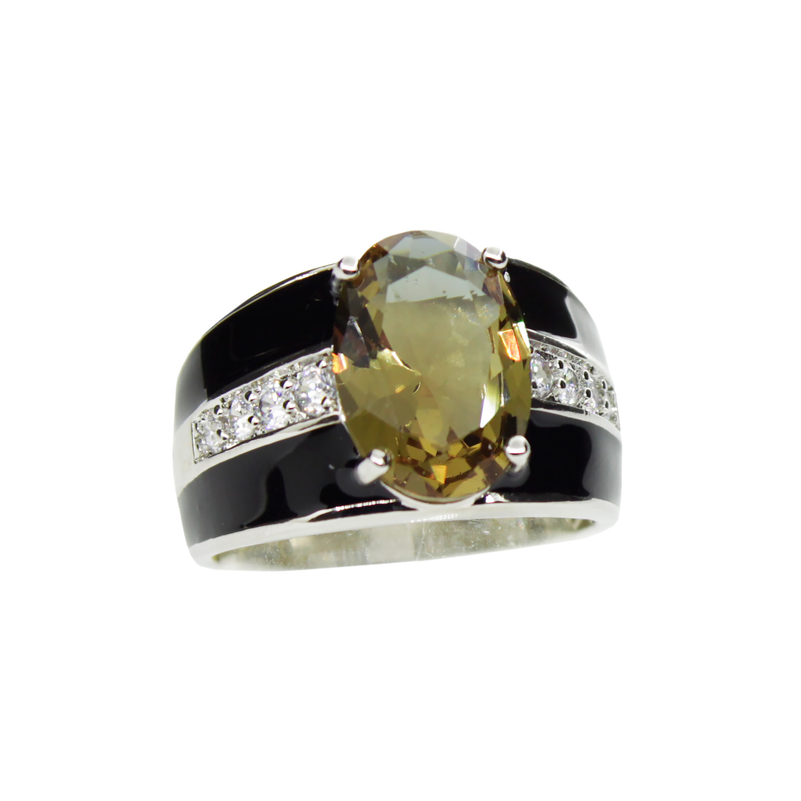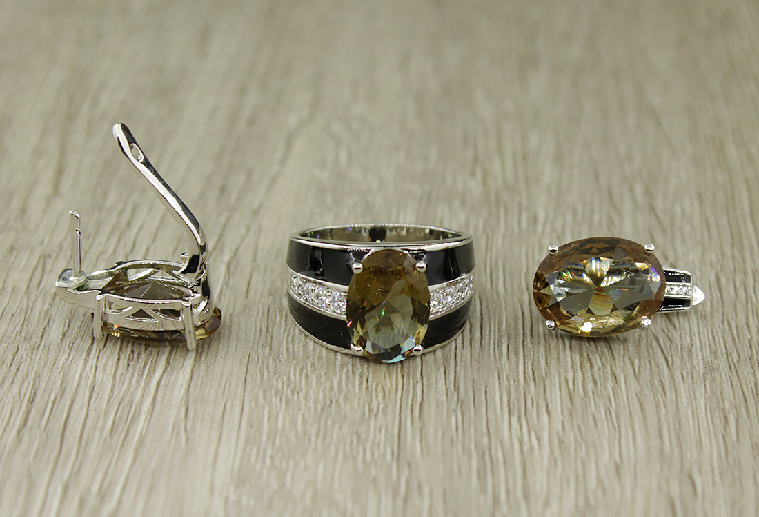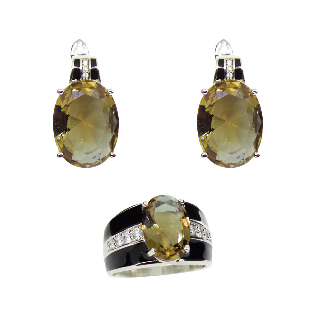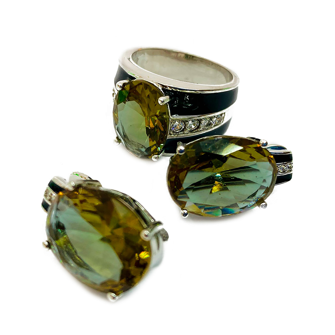 Солидный комплект со вставкой из султанита и родированным покрытием. Длина серьги с застёжкой: 22мм. Размер камня на серьге: 12х16мм. Размер камня в кольце: 5х8мм. Находится на удаленном складе (отгрузка на 2 дня позже).
