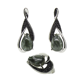 Элегантный комплект с натуральным серафинитом и качественным покрытием. Размер камня в серьге: 8x12мм, размер серьги с застежкой: 30мм. Размер камня в кольце: 8x12мм.