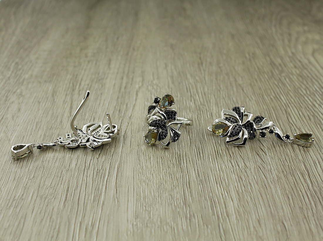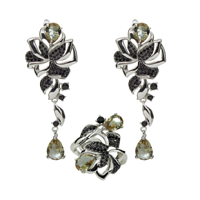 Солидный комплект со вставкой из удивительного камня султанит и родированным покрытием. Длина серьги с застёжкой: 45мм. Размер камней в серьге: 5x7мм и 6x8мм. Размер камня в кольце: 5x7мм и 6x8мм. Находится на удаленном складе (отгрузка на 2 дня позже).