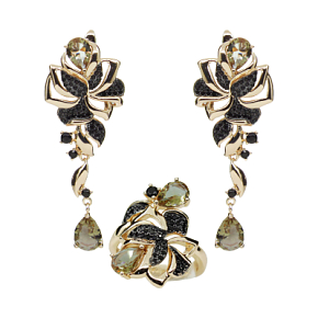 Солидный комплект со вставкой из удивительного камня султанит и качественным покрытием. Длина серьги с застёжкой: 45мм. Размер камней в серьге: 5x7мм и 6x8мм. Размер камней в кольце: 5x7мм и 6x8мм. Находится на удаленном складе (отгрузка на 2 дня позже)