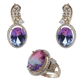 Удивительный комплект с фианитом "турмалин" фиолетово-голубого цвета. Размер камня в серьге: 12х16мм, размер серьги с застежкой: 36.5мм. Размер камня в кольце: 12х15мм.Ширина кольца 20мм