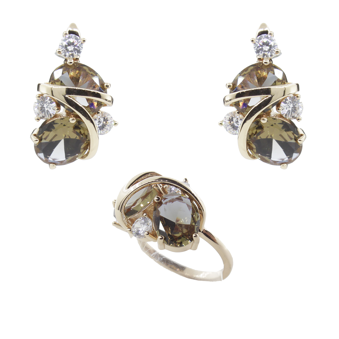 Нежный комплект со вставкой из султанита и качественным покрытием. Размер камня в серьге и кольце 6,5х10мм. Размер серьги 14х23мм. Размер кольца 13х22мм. Комплект находится на удаленном складе (отгрузка на 2 дня позже).