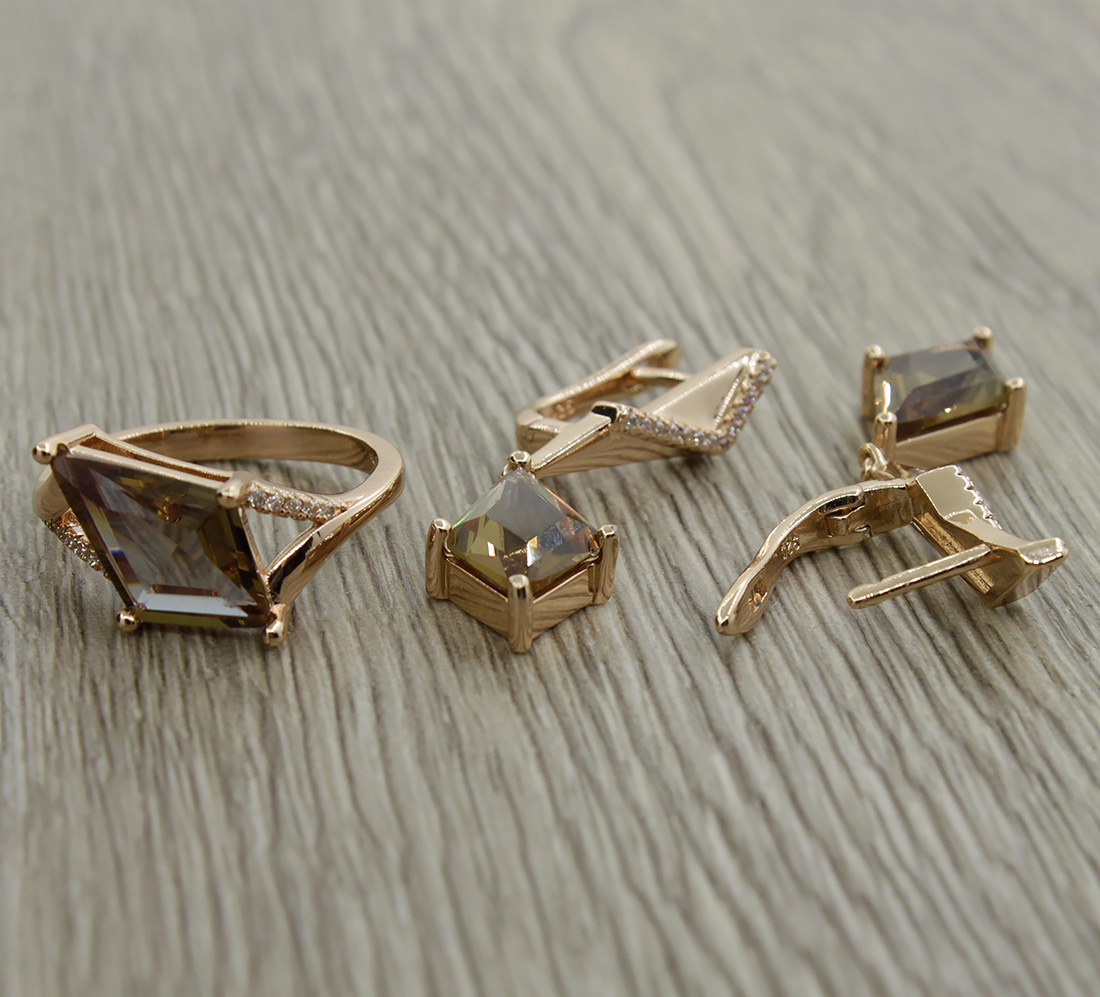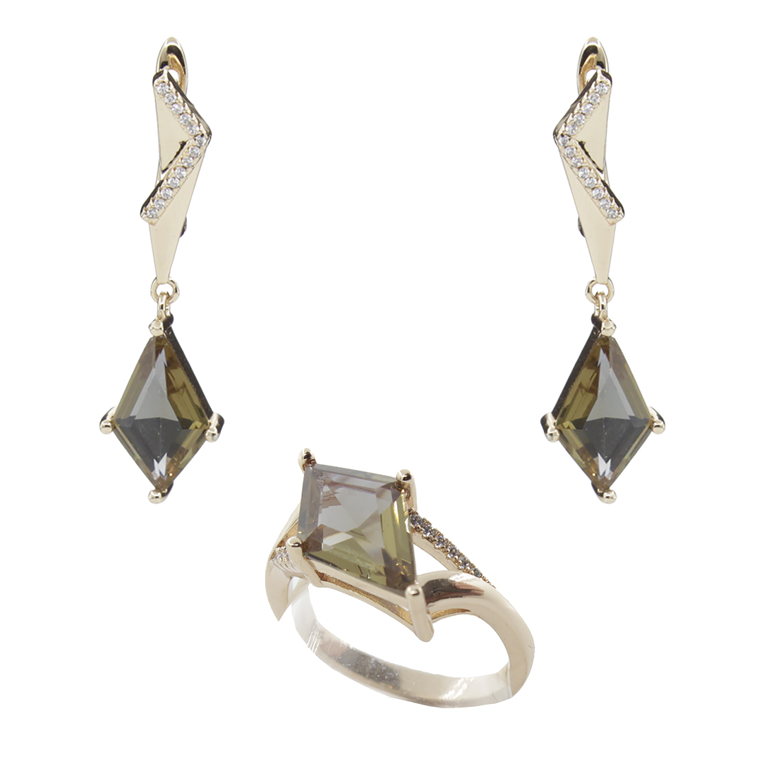 Модный комплект со вставкой из султанита и качественным покрытием. Размер камня в виде ромба в серьге и кольце 9х15мм. Длина серьги 40мм. Комплект находится на удаленном складе (отгрузка на 2 дня позже).