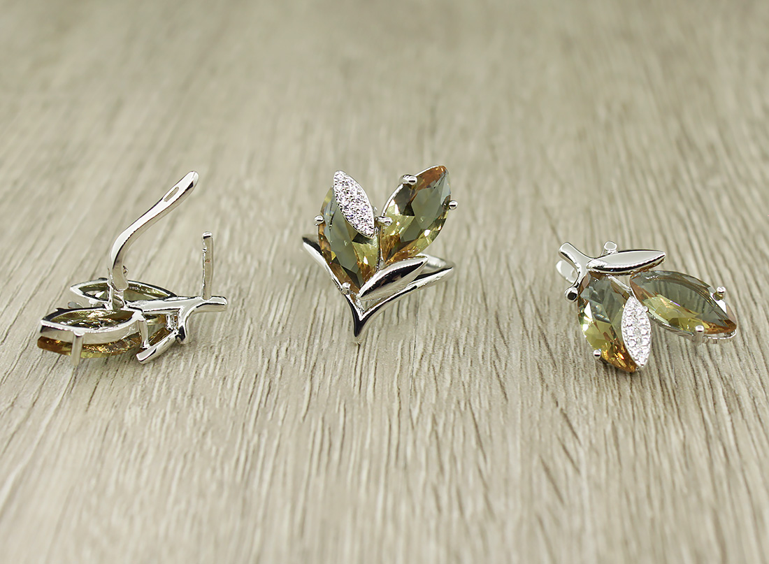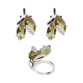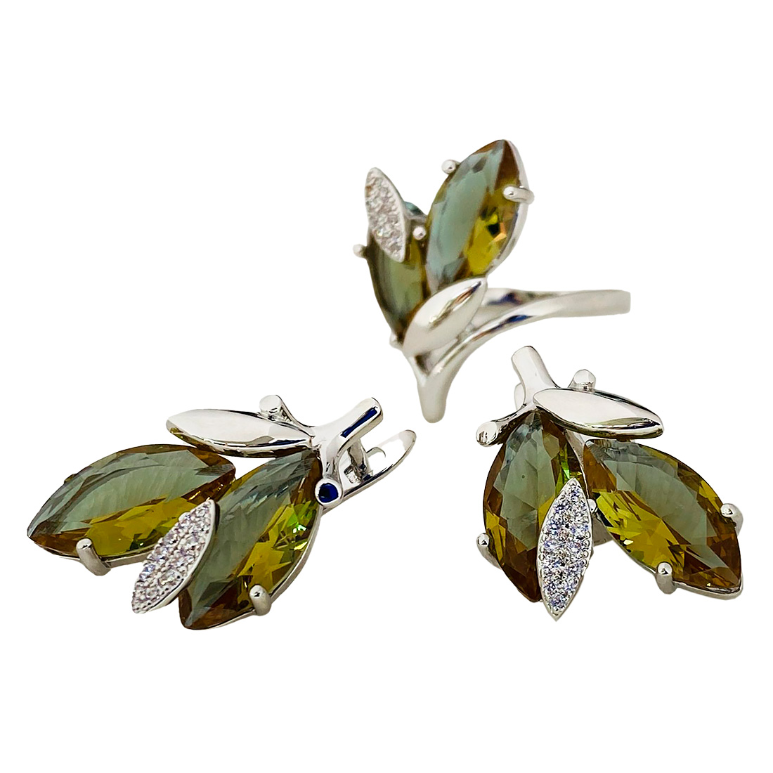 Солидный комплект со вставкой из султанита и родированным покрытием. Размер камня - 7х14мм. Находится на удаленном складе (отгрузка на 2 дня позже).