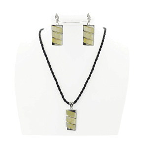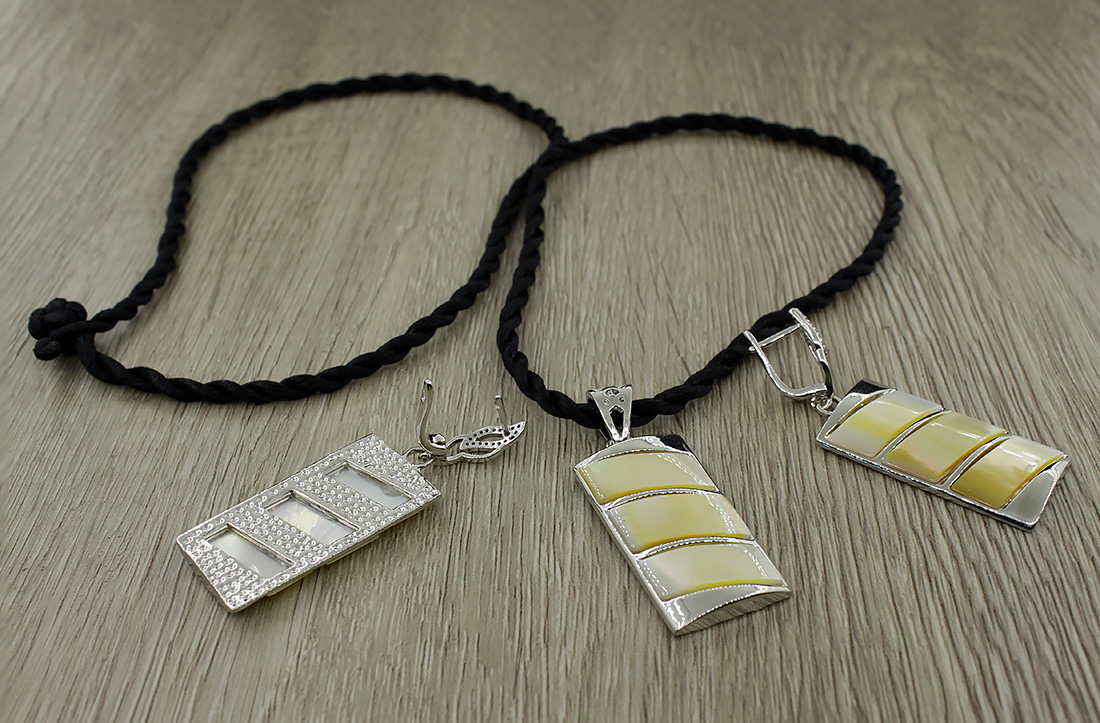 Кулон и серьги изготовлены из натурального перламутра бежевого оттенка. Застежки на серьгах дополнены мелкими стразами. Набор выглядит элегантно и благородно. Длина шнурка 60см. Размер кулона 18х34мм, размер серег с застежкой 18x53мм.