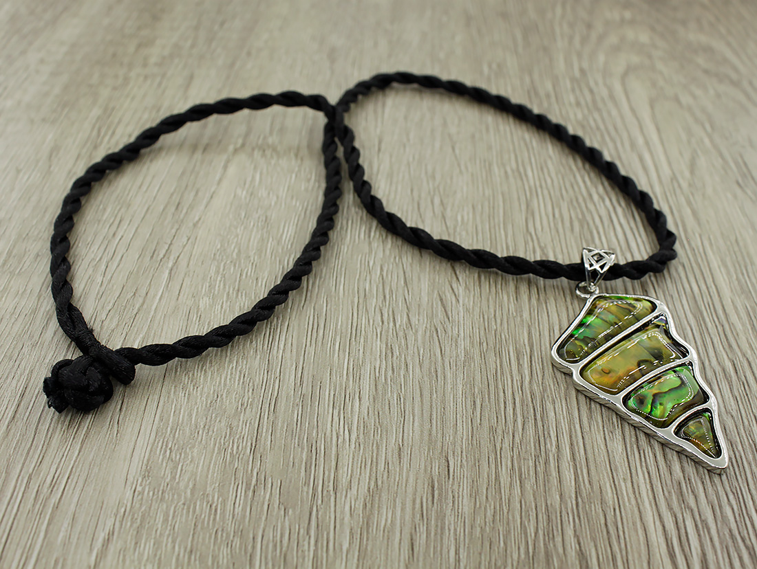 Очаровательный кулон в виде Морской ракушки с вставками из гелиотиса переливается различными оттенками. Длина шнурка 48см. Размер кулона 27х58мм.