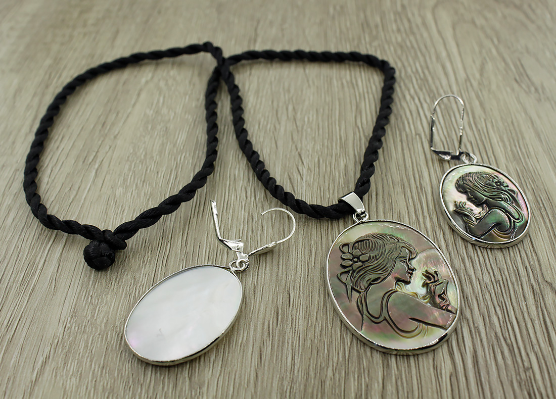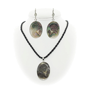 Камея с юной девушкой в этом наборе вырезана из цельного кусочка перламутра. Станет нежной деталью Вашего образа. Длина шнурка 48см. Размер кулона 30х39мм, размер серег без застежки 23х29мм.