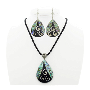 Кулон и серьги в форме капель изготовлены из натурального гелиотиса и украшены завитками. Заметный аксессуар, который привлечет к Вам внимание. Длина шнурка 50см. Размер кулона 40х54мм. Размер серег 30х38мм.