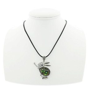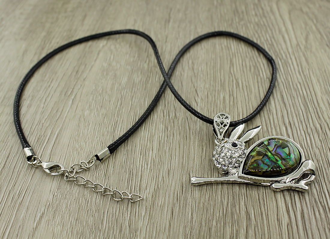 Очаровательный кулон в виде кролика с вставкой из гелиотиса, которая переливается различными оттенками. Голова кролика украшена белыми стразами. Длина шнура 45-50см, регулируется с помощью цепочки. Размер кулона 34х48мм.