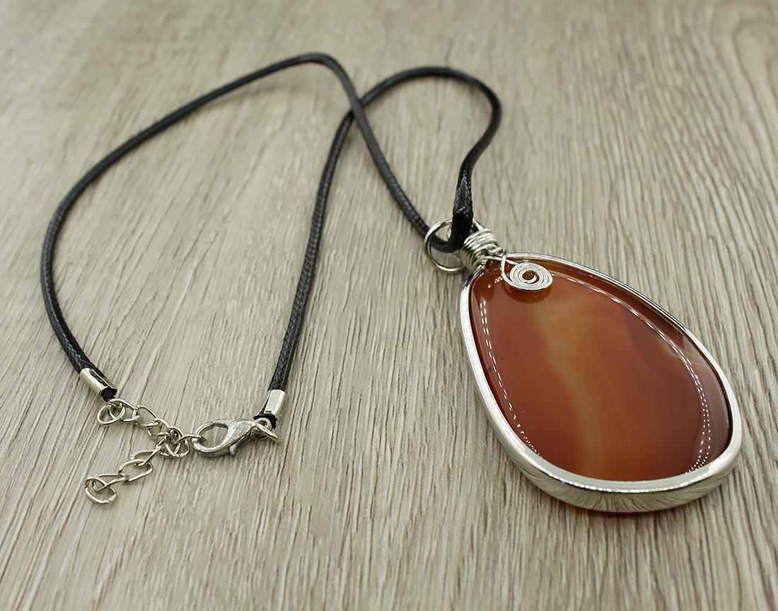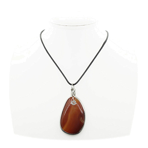 Массивный кулон из коричневого агата, украшенный завитком. Ваш образ, дополненный этим кулоном, обязательно привлечет внимание. Длина шнура 44-48см, регулируется с помощью цепочки. Размер кулона 38х67мм.