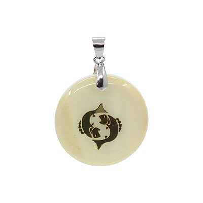 Круглый кулон выполнен из белого перламутра с золотистым рисунком знака зодиака Рыбы. Диаметр кулона 30мм.
