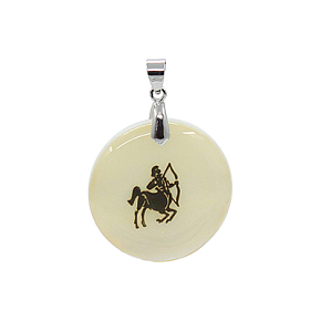 Круглый кулон выполнен из белого перламутра с золотистым рисунком знака зодиака Стрелец. Диаметр кулона 30мм.