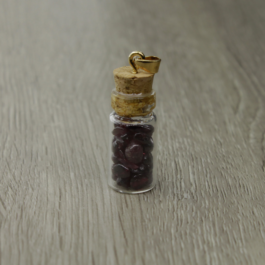 Миниатюрная подвеска в виде бутылочки, наполненной натуральным гранатом, прекрасно впишется в Ваш повседневный образ. Размер колбочки: 3 см.