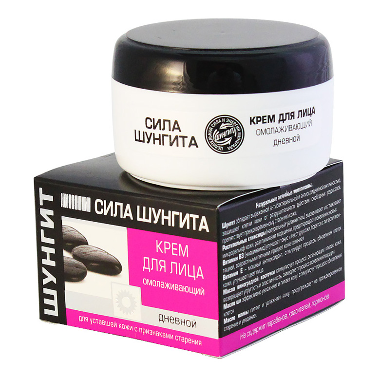 Крем для лица дневной омолаживающий «Сила шунгита» содержит в себе сбалансированный комплекс натуральных активных компонентов, глубоко увлажняющих кожу, которые стимулируют процесс регенерации, повышают эластичность, способствуют разглаживанию морщинок, а так же оказывают активное антиоксидантное действие и возвращают здоровый цвет и сияние коже лица.