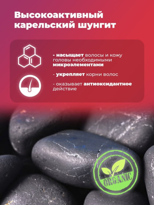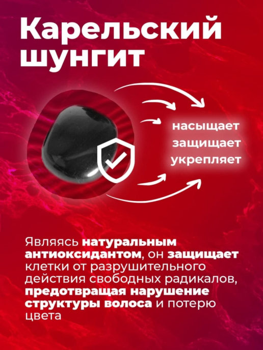 Этот шампунь создан на основе натурального карельского минерала шунгит. Он тщательно очищает волосы и кожу головы, снижает выпадение волос, помогает восстановить естественный баланс кожи головы, препятствует образованию перхоти, лучшает микроциркуляцию крови в коже головы, насыщает ее необходимыми микроэлементами, укрепляет корни волос, защищает клетки от разрушительного действия свободных радикалов, предотвращая нарушение структуры волоса и потерю цвета. Шампунь легко смывается и может применяться для любого цвета волос.