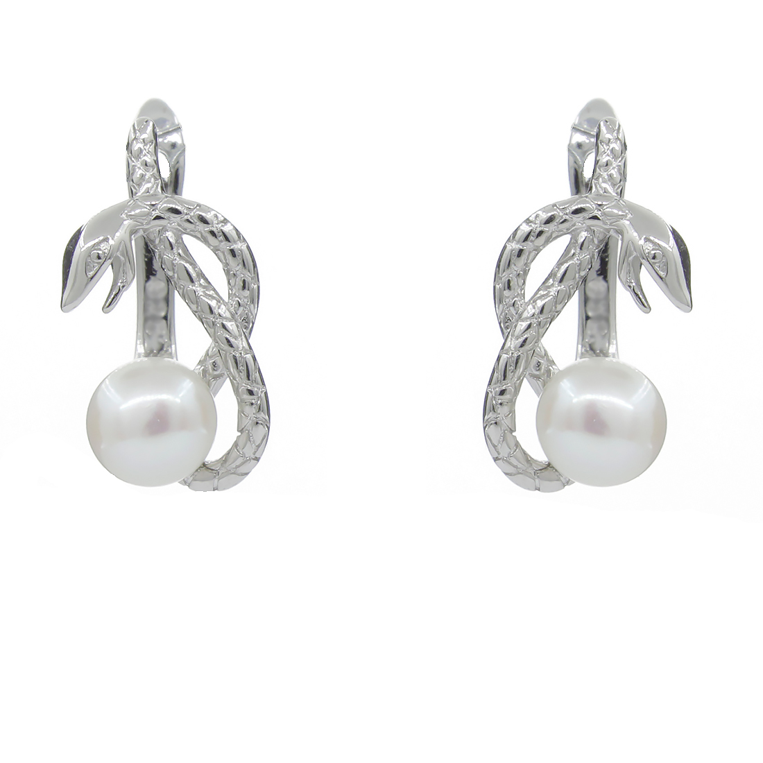Нежные и романтичные сережки в виде змеи с белым жемчугом. Размер жемчуга 6мм. Размер серьги 10х19мм
